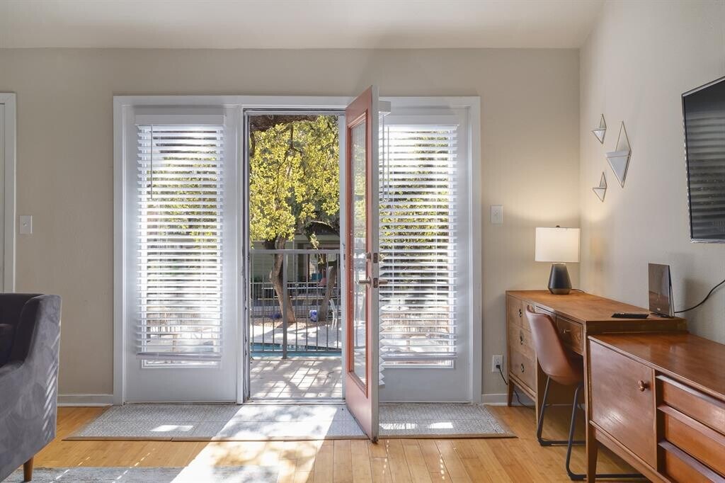 Welcome to your peaceful oasis just 3 miles from downtown Austin. This beautifully updated one-bedroom condo at The Sanctuary offers the perfect blend of comfort, style, and convenience. With vaulted ceilings and large windows, the space is filled with natural light and offers stunning views of the community pool from both the living area and your private balcony—the perfect spot for morning coffee or a relaxing evening. Inside, you’ll find a thoughtfully laid-out floor plan that makes the most of the space, with a bright living area, functional kitchen, and a cozy bedroom tucked away for privacy. The brand new HVAC system keeps things cool and efficient, helping to keep utility bills low year-round. Whether you’re working from home or commuting, the location is ideal—just minutes from South Congress, Zilker Park, and a quick 10-minute drive to the airport. This tight-knit 32-unit community offers a quiet, neighborly feel that’s hard to find in the city. With a sparkling pool, well-maintained grounds, and flexible lease terms ranging from 6 to 24 months, this condo fits a variety of lifestyles—from remote workers and corporate relocations to locals looking for a fresh start. If you’re looking for low-maintenance living with all the charm and none of the hassle, this one’s hard to beat. Walkable to Radio Coffee and Beer on one side and Kerbey Lane Cafe and Torchy's Taco's the other side!