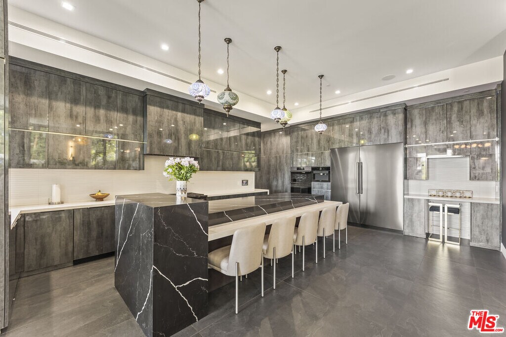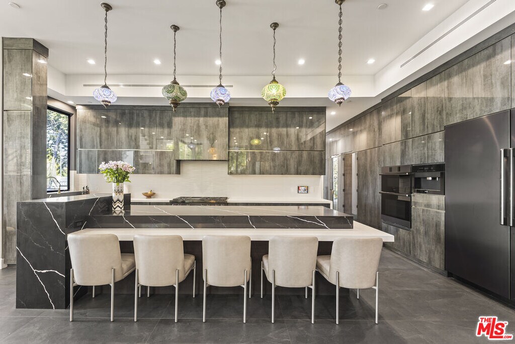 Set high in the Hollywood Hills, this designer estate by Alon Zakoot blends modern design with a twinkling of romantic Old World charm, offering privacy, sophistication, and the essence of a true California getaway. From its elevated perch, enjoy panoramic views with Universal Studios' iconic Harry Potter castle as your backdrop.Inside, timeless finishes meet artistic detail. Stone floors flow into a chef's kitchen with premium appliances, while handcrafted Moroccan lighting sets the mood in the dining space. The living room, crowned with a luminous ceiling and framed by retractable glass doors, opens seamlessly to the outdoors connecting to an oversized infinity pool suspended 20 feet above ground, lush gardens, and expansive entertaining areas.The primary suite offers a private sanctuary with a balcony, spa-like bath, and generous closet space. All six bedrooms feature unique details, private balconies, and outdoor privacy. A family room with direct access to the outdoor lounge invites effortless gatherings. This estate is designed for both comfort and entertainment, with an elevator, rooftop deck, outdoor kitchen, poolside BBQ, and resort-like greenery. An ADU adds flexibility for guests or extended living. More than a home, this is a lifestyle. Property was built in 2022. MLS# 25587215