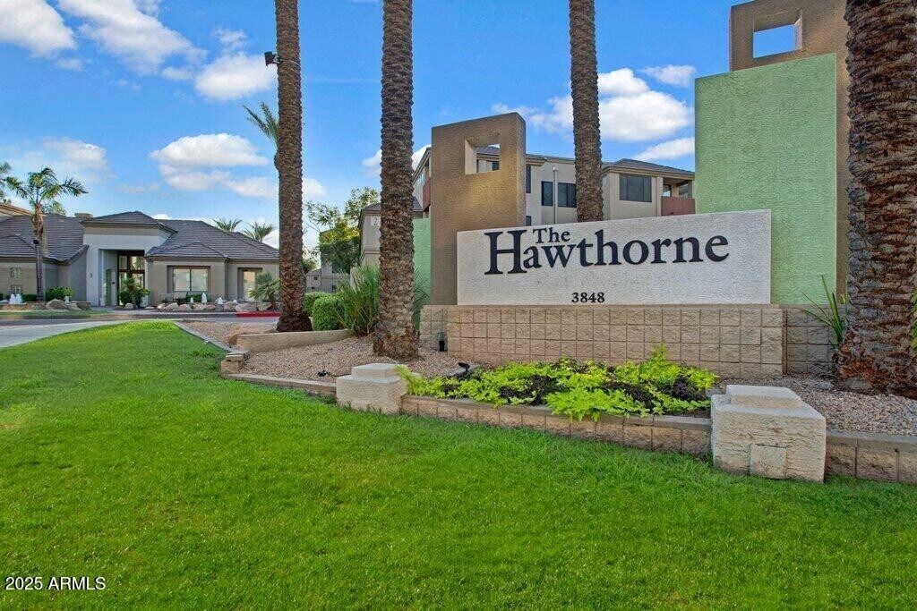 Light & bright one-bedroom condo in luxurious gated Hawthorne community!! Spacious floor plan w balcony. Brand-new Carpet! Beautiful well-equipped fitness center,clubhouse,pools,spas,barbecue grills and more! Resort surroundings in the heart of Phoenix Prime location close to everything: Great restaurants,entertainment,shopping,parks & recreation,all freeways and light rail.
