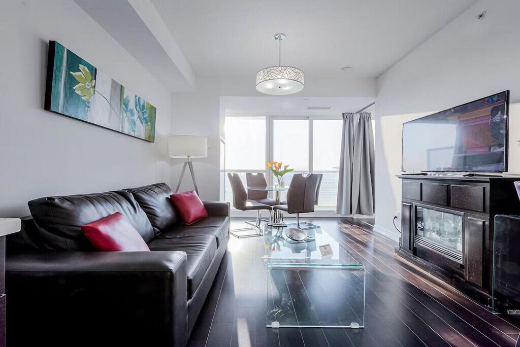 The advertised rate of C$8,878/month is the lowest available price, based on a 30 day(s) stay with a move-in date of October 17, 2026. Rates vary depending on the duration of stay, season, and other parameters. For exact pricing and additional pricing components, please visit our website and enter your desired move-in and move-out dates. The rate is applicable when billed upfront; it can be higher if billed in multiple payments. Feel at home in this comfortable 2-bedroom suite located in Aura at College Park, an iconic landmark on the Toronto skyline and the tallest residential building in Canada. Aura Condos stands at 78 storeys with 995 units. This suite features a fully functional kitchen with supplies such as tea, coffee, a kettle, coffeemaker, and toaster. A washer and dryer are available with supplies. The bathroom includes towels, shampoo, conditioner, body wash, a hair dryer, and other toiletries. Underground parking with in/out privileges is available upon request for an additional fee of $50 per night, with a minimum rental term of 3 nights. It's recommended to request it in advance as spaces may be limited. In case of no availability, there is paid underground parking nearby. Floors 1–3 include major retailers (IKEA, Marshalls), banks, restaurants, and cafes. Enjoy direct access to the PATH network and College subway station, directly connected underground to a shopping mall. Pets are not allowed. Guests must be 18 or over in order to check in. [SI]