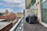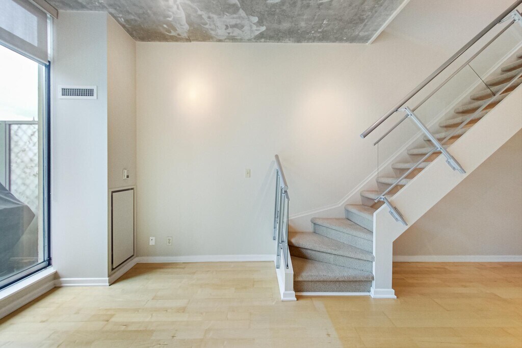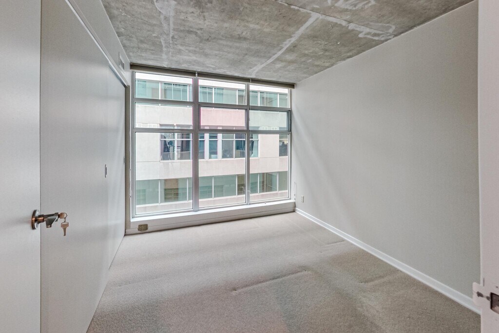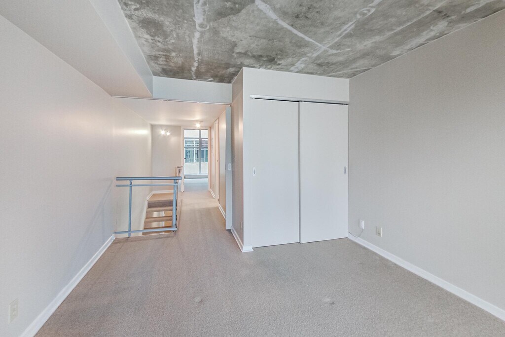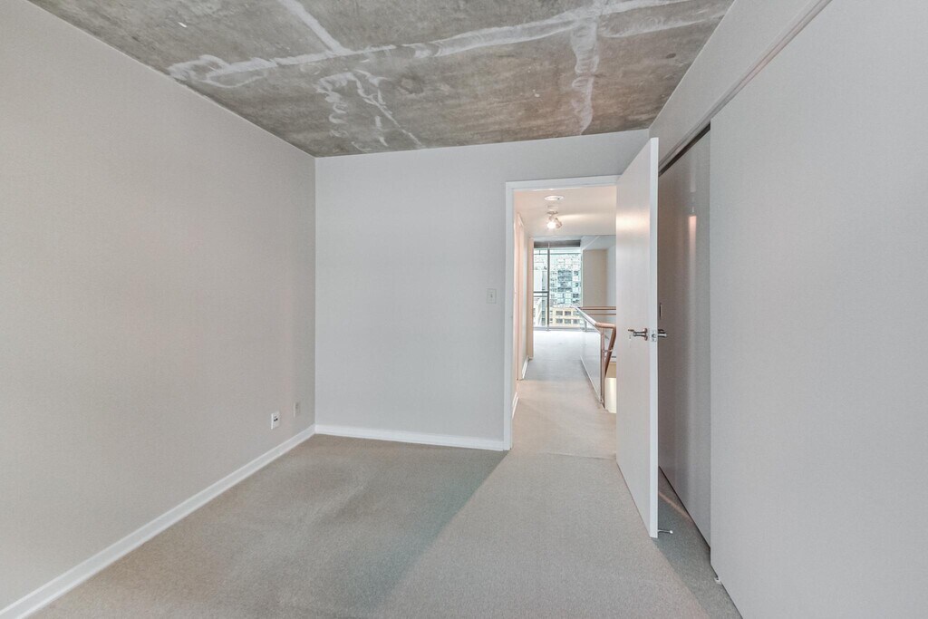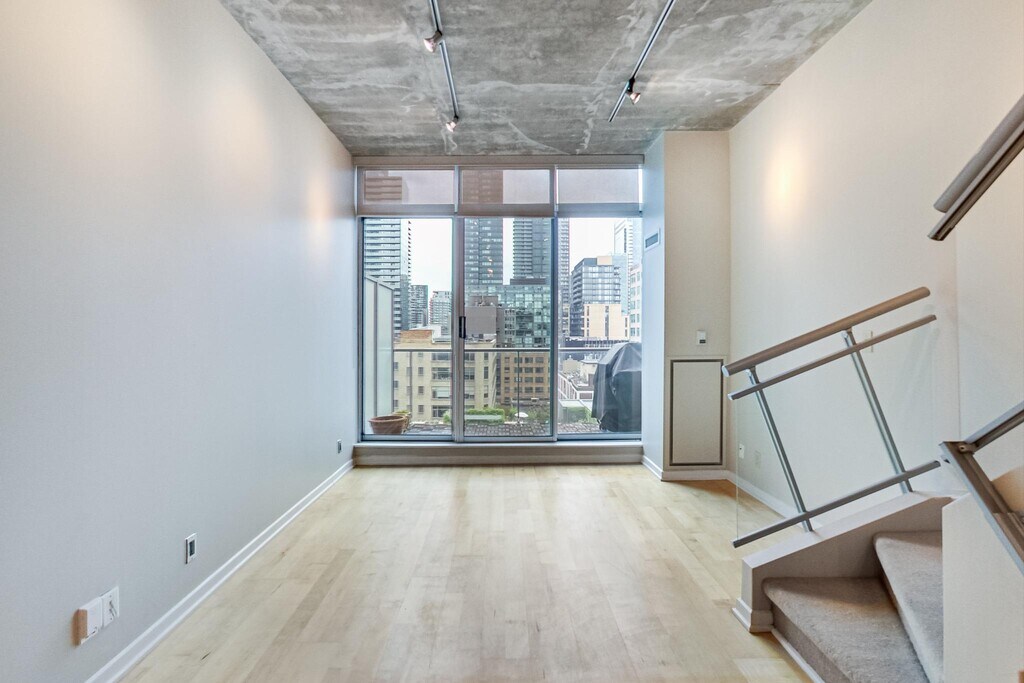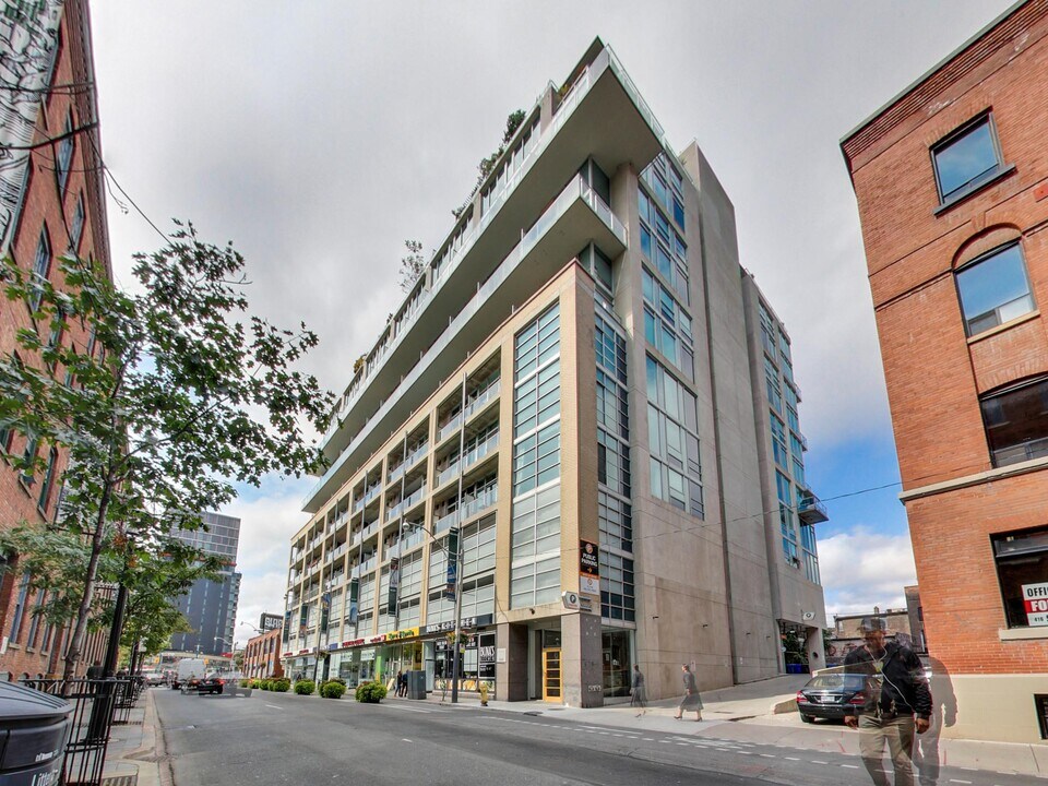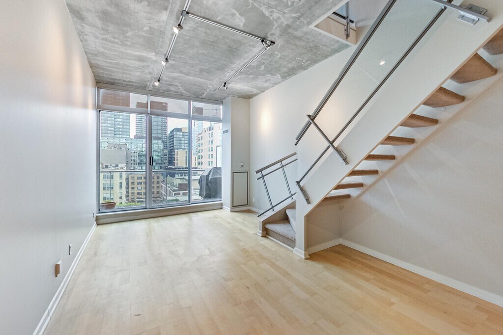 Introducing a rare offering at the iconic District Lofts - an award-winning boutique building celebrated for its architectural design and timeless urban character. This beautifully appointed 2-storey, 2-bedroom loft combines style, function, and an unbeatable downtown lifestyle. The main level features an open-concept kitchen, living, and dining area with soaring concrete ceilings and floor-to-ceiling windows that fill the space with natural light. Step out onto your south-facing balcony and enjoy unobstructed views of the city skyline - and the added benefit of BBQ use permitted, a rare luxury in condo living. Upstairs, you'll find two generously sized bedrooms and a well-designed 4-piece bathroom, offering both comfort and privacy away from the main living space. Perfectly situated between King West and Queen West, you're just moments from Toronto's best shopping, dining, entertainment, and transit. A true urban oasis for those seeking a stylish downtown home in one of the city's most sought-after neighbourhoods.