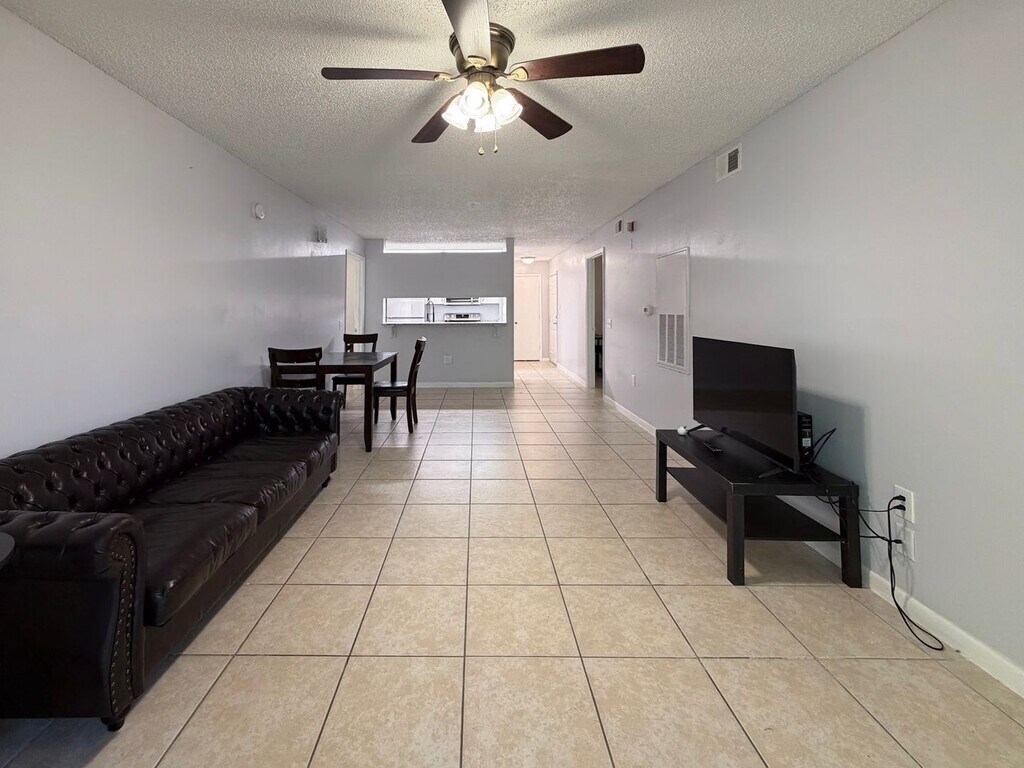 Welcome to the Beautiful 4/4 Condo in University Terrace, located in the vibrant city of Gainesville, FL just minutes from the University of Florida and Shands. This ground-floor condo boasts four spacious bedrooms with a mounted television, laptop desk, mini two-door fridge, and an en-suite for added convenience. The open floor plan is accentuated by laminate flooring throughout, giving the space a sleek and modern feel. The kitchen is a chef's dream, equipped with stainless steel appliances, granite countertops, and a breakfast bar for casual dining. The condo is fully furnished and comes with a host of amenities, including cable-ready rooms, ceiling fans, Wi-Fi, and a dishwasher. The unit also includes a washer/dryer, central air conditioning, and central heating for your comfort. The absence of carpet and stairs makes maintenance a breeze. Step outside to your patio or take a dip in the community pool. Pest control is included, and a community dumpster is available for your convenience. Community is on a direct bus route. No Pets. A few minutes to reach the local YouFit gym, Peach Valley Cafe, or Gainesville's favorites in Butler Plaza.