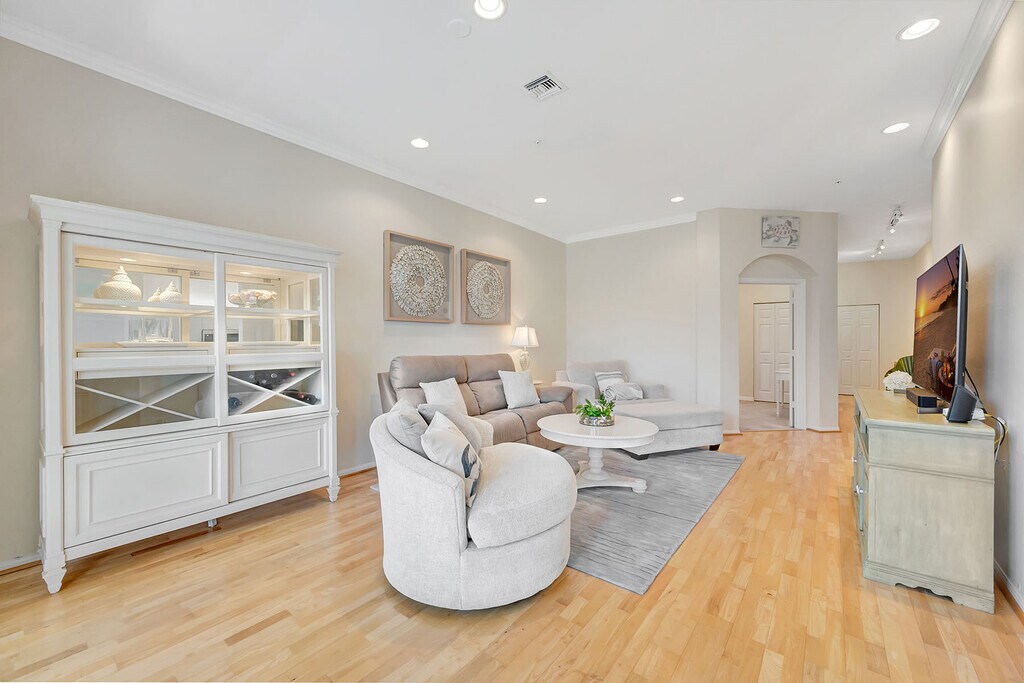 What a View!!! This 2nd floor,corner property offers 3 full bedrooms and 2 baths plus extended kitchen,offers a king bed with TV,a second king in the first guest bedroom with twins in the second guest bedroom. 1 car attached garage,10ft vaulted ceilings. Guests will absolutely love the stunning view overlooking the Tropical Lake with waterfalls and sparkling fountains,not to mention the SW view offering gorgeous sunsets as they relax on the oversized lanai. Guests will enjoy the world class amenities of Pelican Bay including two private casual beachfront restaurants,beach shuttle,beach chair & umbrella set-up service,tennis club (pay per play),community fitness center,walking trails and more.