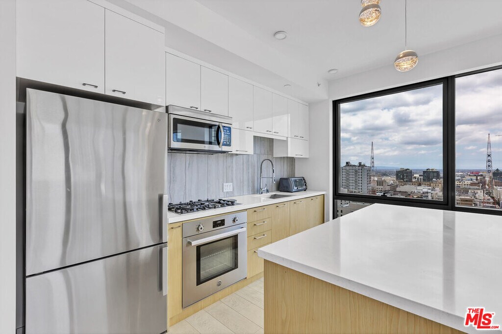 *BRIGHT FURNISHED OR UNFURNISHED CONTEMPORARY 1BR/1BA WITH NEARLY FLOOR-TO CEILING WINDOWS. AVAILABLE FOR SALE / LEASE TO BUY OPTIONS. 1 ONSITE PARKING SPACE INCLUDED IN COVERED GARAGE. WATER, TRASH, GAS & ELECTRIC INCLUDED. SMALL PETS CONSIDERED WITH ADDITIONAL PET DEPOSIT.* Welcome home to Unit 502 well-appointed true 1BR floorplan with earthy, luxurious tones and NY-style city views greeting you upon entry. Enjoy utilizing premium Bertazzoni stainless steel cooking appliances and in-unit Bosch washer/dryer. Indulge in your self-care ritual inside the designer bathroom with polished chrome finishes, deep-soaking tub and rainfall showerhead, and illuminated mirrored medicine cabinet. As the tallest and newest highrise building in the Historic Core, Perla on Broadway boasts over 44,000 square feet of luxurious and plentiful amenity spaces perfect for decompressing or entertaining, including: A truly expansive, 360-degree panoramic rooftop lounge and BBQ area on the 35th floor, chic interior courtyard with yoga studio, modern gym, gaming lounge, dining rooms, gourmet chef kitchens, outdoor BBQ areas in landscaped terraces, heated resort-style pool, dog walk and pet spa area, and more! Centrally located in Los Angeles and a stone's throw away from the famous Grand Central Market, 1 block from the architectural wonder the Bradbury building, 1 block to the Angel's Flight railroad which carries you up to the Walt Disney Concert Hall and modern/cultural art museum The Broad, while being accessible to the Metro station 1 block away which can bring you through to Hollywood, all the way to the beautiful coastline at Santa Monica pier, and more. A true walker's paradise, take a stroll to any amenities DTLA has to offer such as the Arena, Michelin star restaurants, unique bars, and nearly infinite events and activities. MLS# 25596355