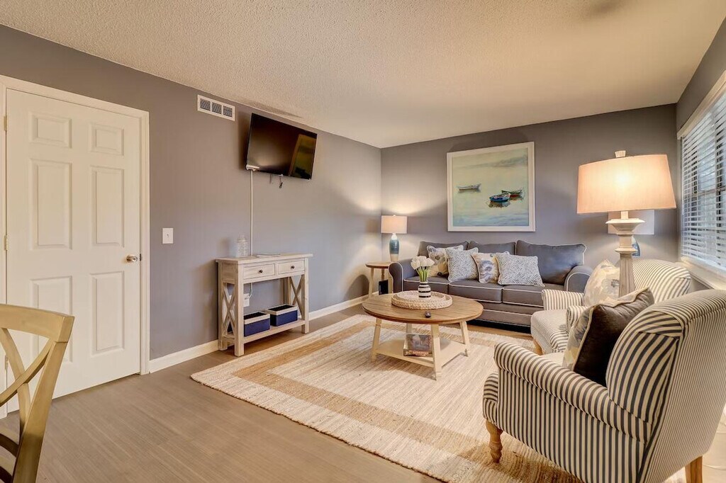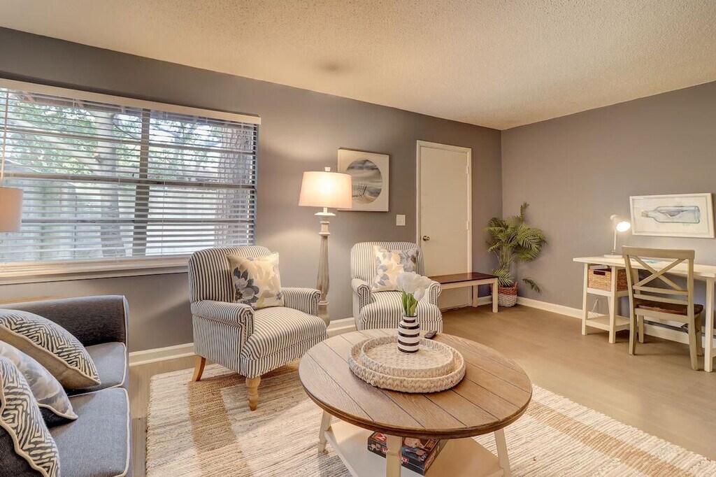 Feel at home in this renovated 2-bedroom townhome in Hilton Head, designed to comfortably sleep six guests with a sofa bed. This 1,200 sq ft townhouse is perfectly placed for exploring the island. The first floor features an open-concept living and dining area with cozy seating. The modern kitchen is fully equipped for preparing meals. A full laundry room is also available. The second floor features two beautifully appointed bedrooms, designed for comfort with fresh linens and ample storage. Pets are welcome with a fee of $25 per pet, per night. Each reservation includes parking for up to two cars in the space that matches the unit number. Parking passes will be provided on the kitchen table to be placed on the windshield during the stay and returned to the kitchen table at checkout to avoid replacement fees. Located in the heart of Hilton Head Island, this townhome is next door to the Sea Turtle Marketplace with grocery stores, restaurants, and a Dunkin' Donuts. Burkes and Bradley Beach are only 5 minutes away. Parties are prohibited. Quiet time is from 10 PM to 6 AM. There is a $300 penalty for smoking on the property, and you will be dismissed from the rental without a refund. There is a $250 penalty if noise level or other obscene behavior requires a police callout, and you will be dismissed from the property without a refund. There is a $100 penalty for leaving trash outside the entrance to the property. Once the trash cans are full, please deposit trash in the large trash cans located at the building entrance. Do not throw trash or paper towels in the toilet to avoid clogging; please use the trash can. Check-out is at 10 AM, and a late check-out without authorization will lead to a night-rate cost penalty. [SI]