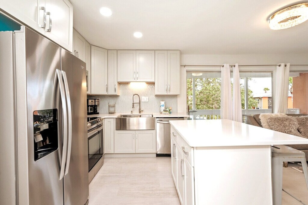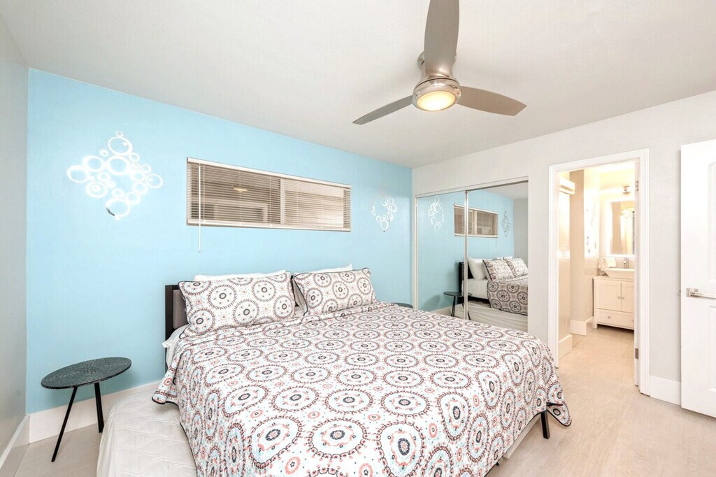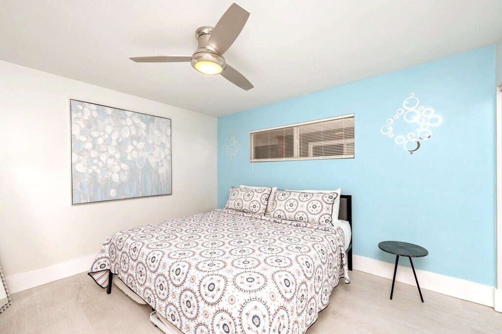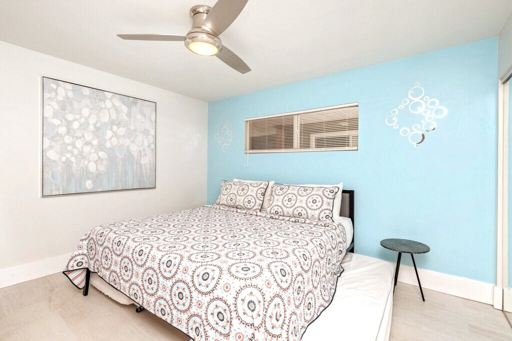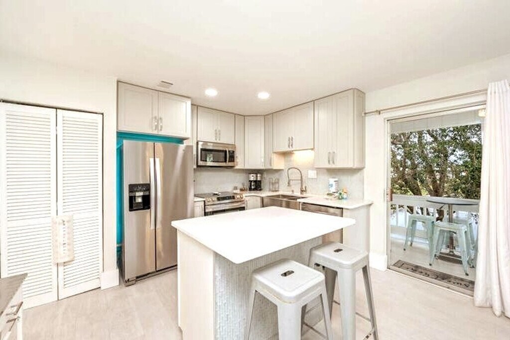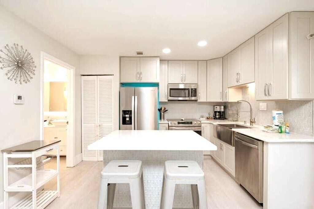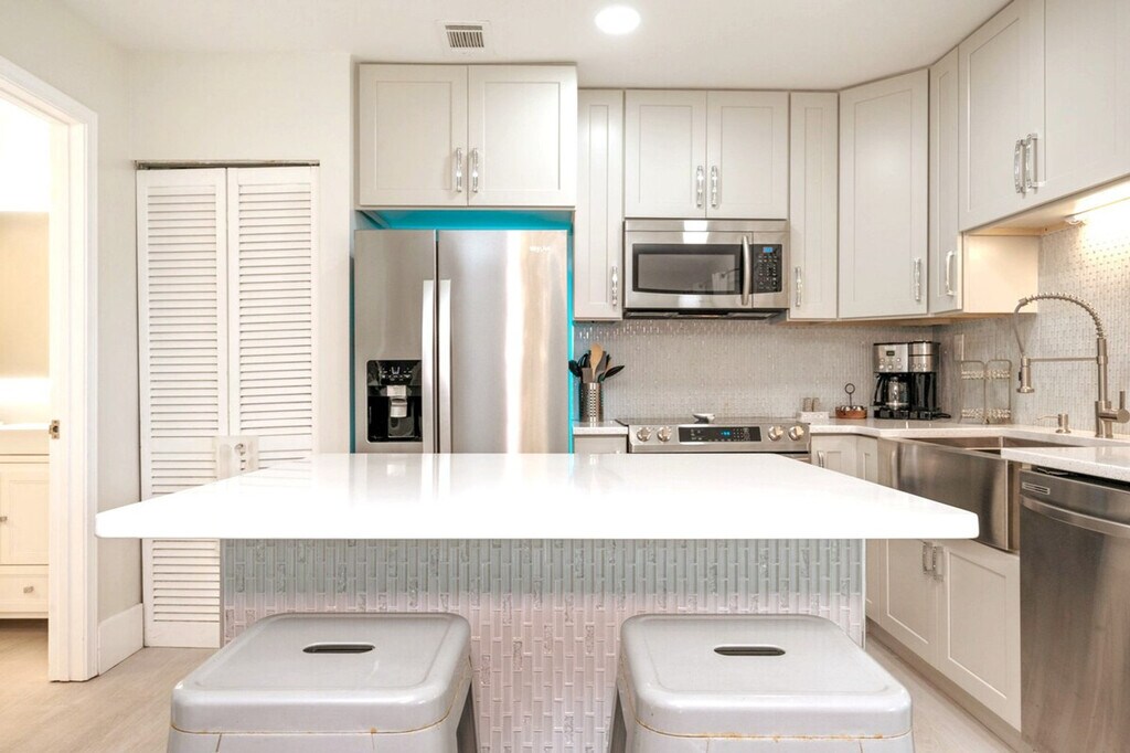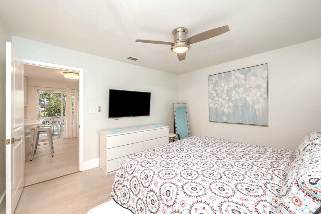 Marvelous Mermaid is the perfect retreat in Destin for up to six guests, plus two pets with a pet fee. With chic style, a central location, and a comfortable layout, it’s ideal for families or friends. Relax with peaceful lake views from the balcony, take a dip in one of three community pools, including a seasonally heated pool, enjoy the tennis courts, and reach public beach access just ¾ mile away. This second-floor unit is accessed by stairs only, with no elevator. Inside, you'll find a clean, fun, and budget-friendly rental space. The living room welcomes you with a cozy and contemporary vibe, featuring a comfortable queen sleeper sofa and two accent chairs. A smart TV with HuluLive is available for your convenience, and guests can log in to their own media accounts. The kitchen area is perfect for dining in, with a full open concept to the living room and a beautiful quartz breakfast bar island. The kitchen is stocked with full appliances, dishes, bakeware, pots and pans, silverware, utensils, a crockpot, a blender, and both a traditional coffee maker and a Keurig. For tiny travelers, there is a high chair, pack and play, and plastic dinnerware. The styled bedroom offers a plush king bed with an abundance of pillows and two twin roll-out trundle beds. The bathroom includes a shower and tub combo, a spacious vanity area with His and Hers sinks, soft towels, and an LED-lit mirror with Bluetooth capability. The laundry room is located off the patio, with a full-sized washer and dryer, iron, and ironing board. Gulf Terrace Condominiums offers electric vehicle charging stations located near the laundry facility and tennis courts. A $50 pet fee applies for house-trained pets, with a maximum of two dogs allowed. Pets must be crated when unattended, and owners are responsible for cleaning up after them indoors and outdoors. Pets are not allowed on furniture. ADA-recognized service animals are exempt from the pet fee, but Emotional Support Animals are not. Gulf Terrace Condominiums are located in the heart of Destin, just minutes away from a variety of dining, shopping, and local hotspots. You’ll be less than a mile from June White Decker public beach access, Big Kahuna’s Water Park, and The Track Family Fun Parks, making it easy to enjoy all the area has to offer. The complex offers the convenience of two entrances, with the main entrance taking you directly onto Destin’s main highway and the side entrance allowing exit onto a side street with a stoplight, perfect for avoiding traffic when the town gets busy. You may occasionally hear noise from neighboring units or common areas, which is outside of our control. Linens and beach towels are provided, along with a courtesy supply of essentials like toilet paper, paper towels, soap, trash bags, dish and laundry detergent. Trailer, RV, box truck, or watercraft parking is not permitted in the complex, and HOA towing fees apply for any violations. A 10 PM noise ordinance is in effect, and excessive noise, parties, illegal activity, or disturbances are not permitted at any time. Check-in time is 4 PM CST, and checkout is 10 AM CST. Any stay past this time will result in an additional day charge. All issues must be disclosed prior to checkout, or guests are held liable for any damages. We do not issue refunds for lack of amenities such as TV, Wi-Fi, or A/C, as these types of outages are beyond our control, but we will do our best to resolve issues as quickly as possible. Any violation of house rules or terms and conditions are subject to eviction without refund. The apartment includes a smart TV and Wi-Fi, allowing for a remote work-friendly environment.