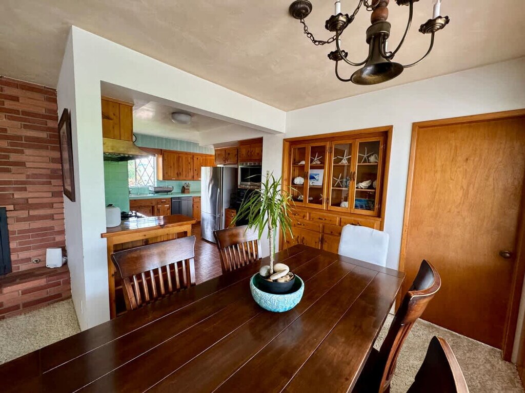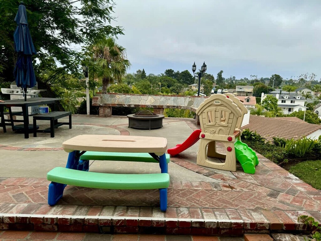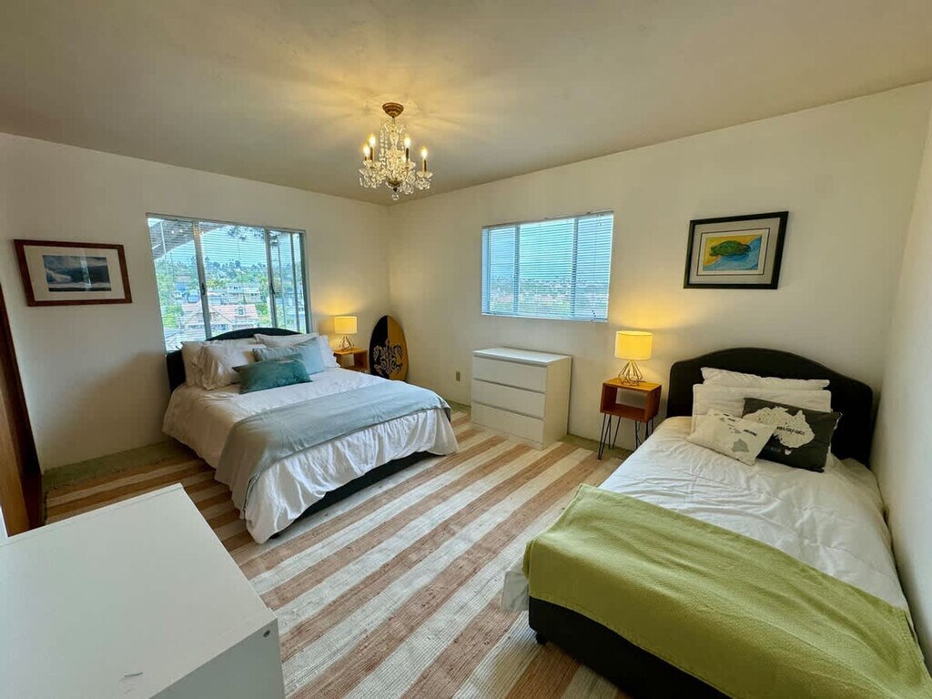 This charming home is located just a mile from Tamarack Beach, offering a peak ocean view and a tropical backyard with an organic fruit orchard, BBQ, and firepit. The property includes a 2-car garage and a washer/dryer. A connected granny flat with a bedroom, bathroom, and spacious living room is available for an additional cost, and renting both ensures a private yard. Inside, you'll find a king bed, two full beds, a twin bed, and a pullout couch. While the fireplace and pizza oven are not operational, the house comes equipped with a juicer to enjoy the delicious organic oranges from the orchard. Beach necessities such as bikes, coolers, beach chairs, and a wagon are provided for your convenience. For those traveling with babies, amenities include an Uppababy stroller with a toddler skateboard attachment, a pack-and-play, and a high chair. Electric car charging is available for an additional $15 per day. Situated just 7 minutes from Legoland, you can enjoy fireworks from the backyard on holidays. The neighborhood is family-friendly and offers easy access to local attractions, making it an ideal spot for a relaxing getaway. The washer/dryer is shared with the downstairs unit when rented. Only friendly dogs are allowed, and there is a $300 charge for any undisclosed guest or pet, and a $500 charge for smoking or having a party. The fireplaces inside are not to be used. [SI]