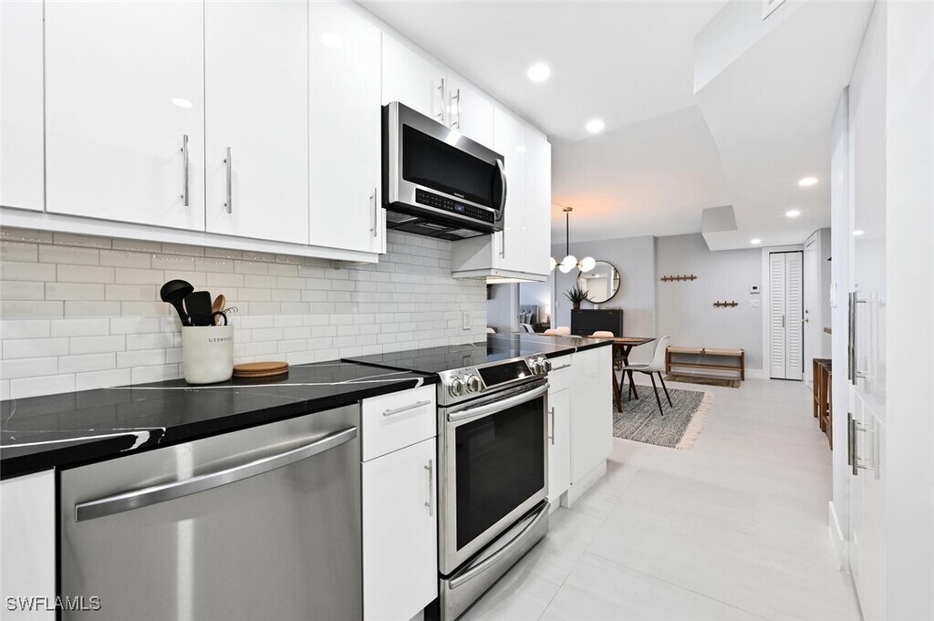 Enjoy Gulf views and sunset skies from every room in this totally renovated 2 BR/2 BA condo. The open floorplan provides abundant natural light that flows from the living room through to the kitchen. The coastal contemporary décor is comfortable and inviting with grey and wood tones throughout. Entertain with ease in the spacious kitchen with new stainless-steel appliances,a custom-built breakfast bar,large pantry,wine refrigerator,and ample counter space. The primary suite has views of the Gulf and features a low-profile bed,built-in storage,dual sinks and walk-in shower. Twin beds in the 2nd bedroom for guests. All of the amenities at Surfsedge have recently been renovated....brand new lobby,fitness center,guest suites and pool/spa area! Surfsedge is located minutes from shopping and dining and offers professional management,friendly staff and 24/7 security. Enjoy the best of Park Shore beachfront living. Live exceptionally in Park Shore!