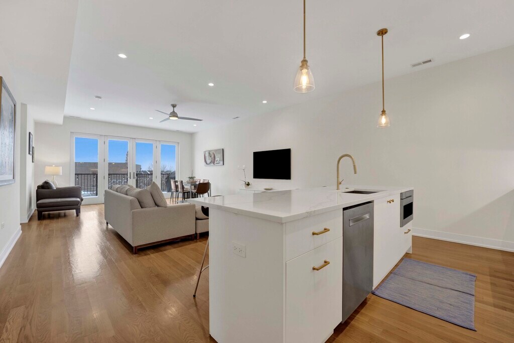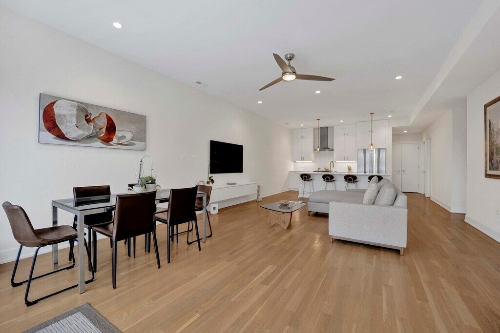 Stunning 3-bedroom, 2-bath luxury condo in the heart of North Center, featuring a bright and spacious open-concept layout with wide-plank hardwood floors throughout. The sleek, modern kitchen offers quartz countertops, custom white cabinetry, updated stainless steel appliances, a large island with seating, and designer pendant lighting, perfect for everyday living and entertaining. The expansive living and dining area is filled with natural light and opens to a private outdoor space through floor-to-ceiling glass doors. The primary suite includes ample closet space and a spa-like bath with contemporary finishes. Additional highlights include in-unit laundry, two private outdoor spaces, central air, and one garage parking space included. Ideally located near North Center dining, shopping, parks, and public transportation.