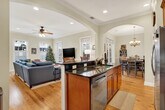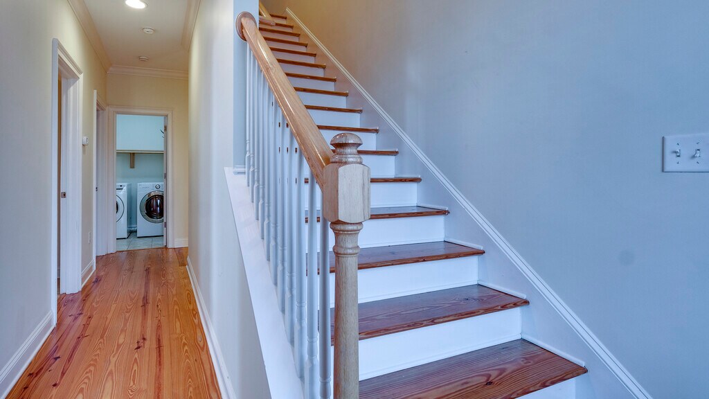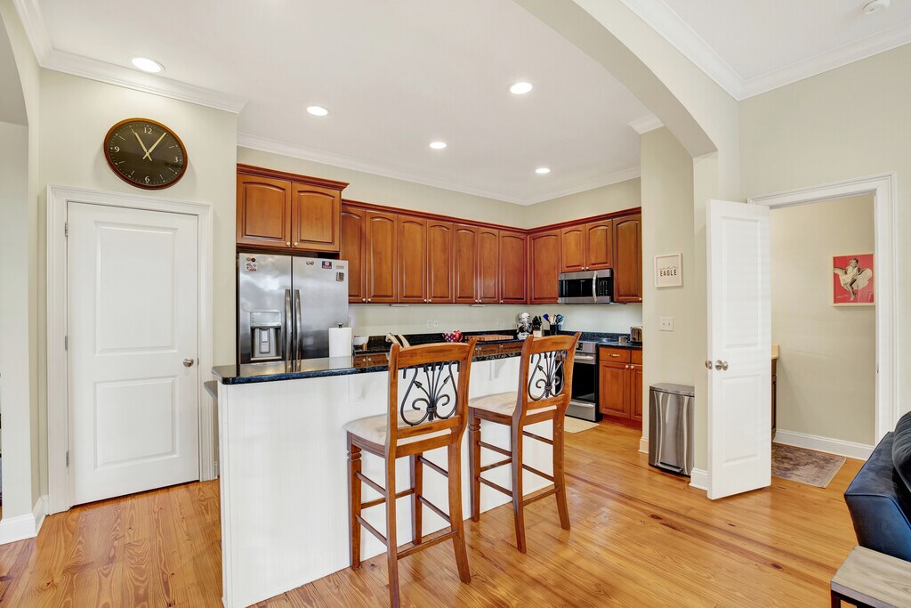 Great location in the center of the historic district. Brick 3 level town house, 2006 construction. High ceilings, great floor plan, granite/wood/stainless steel kitchen. Pine plank flooring, Living room Dining room, Kitchen and powder room on first floor. Second floor is two bedrooms and a bathroom plus laundry room, washer/dryer included. The third floor is 1 giant bedroom plus a spa type master bath with whirlpool tub, dual vanities, separate shower and toilet room. There is also walk in closet for storage. The attic has additional storage. Included is an alarm system with remote key pad and full monitoring by an outside company. There is also pest control services provided and new air conditioning systems for energy efficient cooling/heating. The house has a gated patio for a car or for traditional furniture that is off the dining and family room.