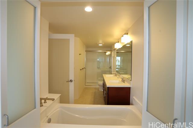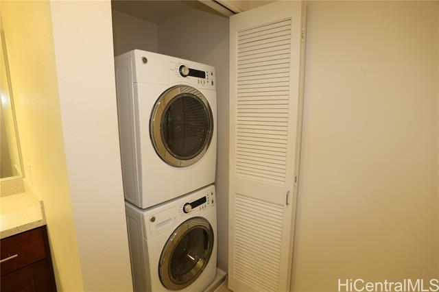 2 bedroom, 2 bath with 2 covered parking (side by side). Unit on top floor of a 4 story building with elevator. Central air conditioning. Stainless steel appliances with solid surface Silestone quartz counter tops in kitchen. Appliances include; range/oven, microwave, dishwasher, French Door stainless steel refrigerator and stack washer/dryer. New interior paint. New carpeting in both bedrooms. Tile floors in living room and kitchen. Master bedroom has a separate shower and tub. Walk-in closet. Window treatments include manual solar shades in living room and both bedrooms. Living area approximately 1,270 square feet. Guest parking available on site. Monthly rent of $4,000 includes water and sewer. Initial lease term: 1 year. No pets/no smoking (no exceptions). For more information or to schedule a showing, please contact John Uyemura (R) at KMJ Realty LLC - .