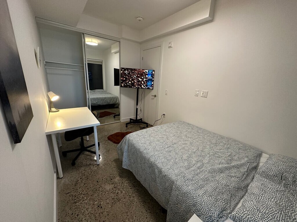 Room for rent: Deluxe Room Rental in Central Toronto The Deluxe Room, situated in our apartment at the bustling intersection of River Street & Queen Street East, combines comfort with practicality in the heart of Toronto. This efficiently furnished room includes a full-size bed, study desk, nightstand, and a modern 40-inch Smart TV, perfect for individuals looking for a functional and cozy living space. Large windows allow plenty of natural light to brighten the room, offering views of the lively urban surroundings. Apartment: River Street & Queen Street East Apartment Choose affordable living in our well-located apartment at River Street & Queen Street East. This option is ideal for renters seeking value in a central location, featuring 4 bedrooms and 1 contemporary bathroom. The apartment provides essential amenities including secure access, a basic gym area, communal laundry facilities, and bike storage. Neighbourhood: Central Toronto Located in the vibrant heart of central Toronto, the apartment at River Street & Queen Street East scores highly for walkability, transit, and bikeability. You'll be in the midst of the city's finest cafes, parks, and nightlife, with everything you need just steps from your door. Its close proximity to the subway station enhances your living experience, facilitating easy exploration of Toronto's many attractions. This apartment represents an excellent choice for those emphasizing location and affordability, providing a convenient room rental in Toronto with necessary amenities and superior transit connections. Note that the images shown are for illustration purposes only, and the actual room and apartment may differ. We recommend a personal visit or a virtual tour to fully appreciate the living space and its setting.