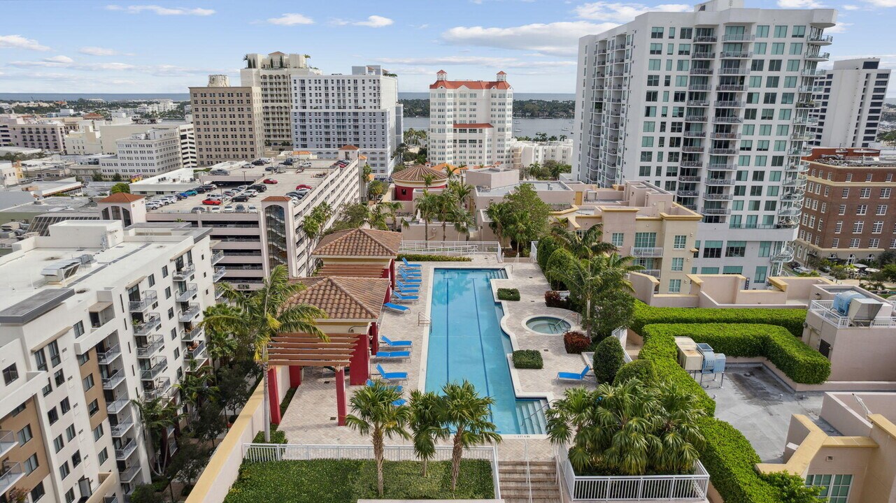 HEART OF DOWNTOWN ~ Plenty of natural light in this luxuriously furnished condo. Featuring high ceilings,tile/ marble flooring,granite countertops,stainless steel appliances,custom European cabinetry,large walk-in closets,hurricane impact windows and washer/ dryer in the unit. Amenities include lush landscape courtyards,rooftop pool,community room for private parties and outdoor BBQ grill,24 hour fitness center,24 hour front desk service and a gated garage. Clematis Street and Rosemary Square contains dining,events and shopping all within a 2 block radius. Rent includes Water/Sewer/Trash,and basic cable/ wifi. Second bedroom features a pull out sofa,queen size bed. Min 6 month rental,9 month term preferred. MLS ID R11163853