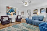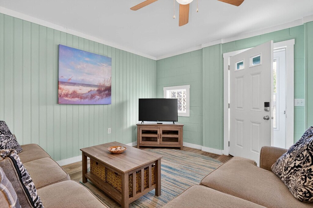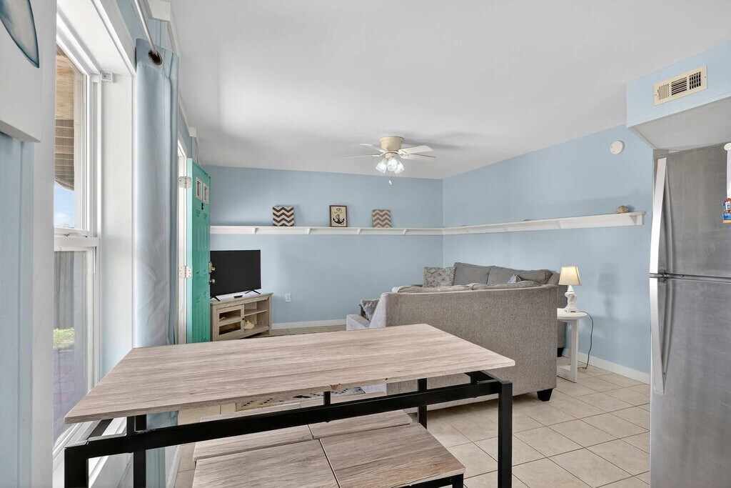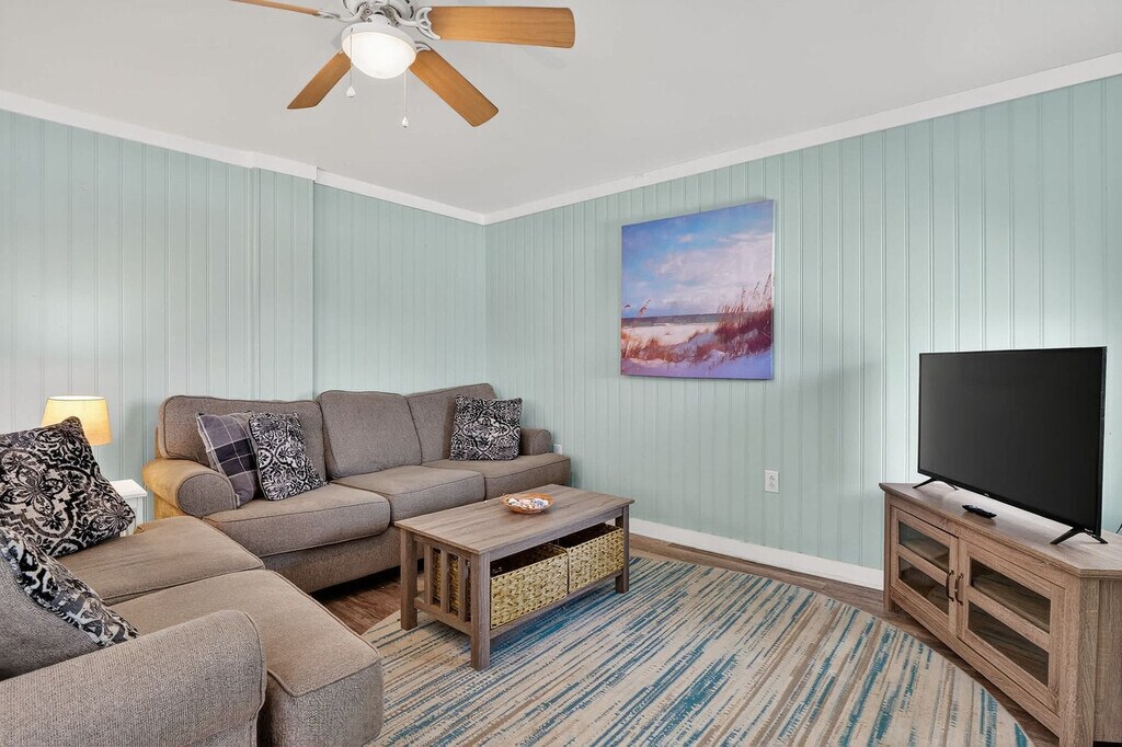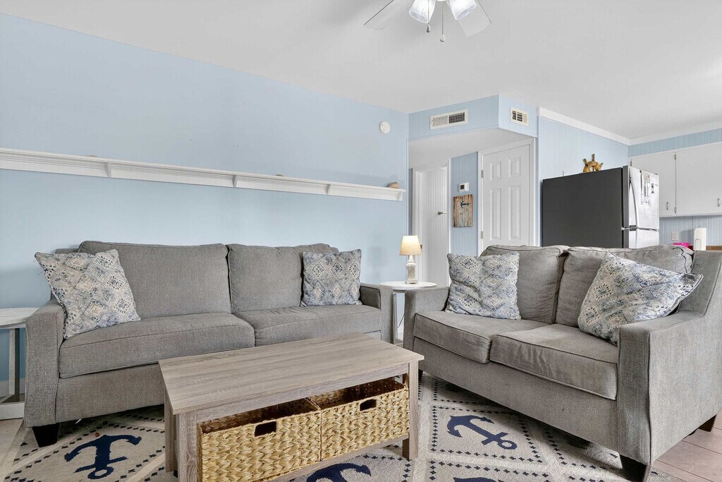 Step into your South Topsail haven with this ground floor 2-bedroom, 1-bath apartment featuring cheerful pastels and comfy furnishings. Feel at home with fast Wi-Fi and Roku TVs for streaming or movie nights, a fully stocked kitchen, and dining for four. The master bedroom offers a queen and a twin bed, while the second bedroom includes a bunk bed and a washer/dryer. Relax on the paved patio with a porch swing and extra seating, just 500 feet from the beach and minutes from the South Topsail Boardwalk. Welcome to your charming South Topsail getaway! This ground floor retreat blends comfort, convenience, and coastal style with pastel-painted walls and comfy furniture creating a warm, inviting atmosphere. Stay connected with blazing fast Wi-Fi, unwind with Roku smart TVs, or enjoy the outdoors on the paved patio with a porch swing. The well-stocked kitchen with all the essentials and a dining table that seats four make it perfect for family meals and entertaining. Need more space? There are two other units in the building. Next door is an identically furnished 2-bedroom, 1-bath sister unit and upstairs has four bedrooms and two baths that sleep ten. South Topsail is an amazing, laid-back community that prides itself on its beautiful beaches and family-friendly atmosphere. Just a short distance from the downtown/boardwalk area, you'll find shopping, restaurants, and ice cream. Nearby attractions include the Jolly Roger pier, the missile museum, and Surf City. Beautiful Wilmington is 40 miles to the south with museums, Battleship North Carolina, Fort Fisher Aquarium, and restaurants. Jacksonville is 20 miles to the north, close to LeJeune's south gate. Pets are not allowed and smoking is not permitted. The minimum age limit for this unit is 18. Children are allowed. We're available 24/7 through phone, text, or email for any assistance you may need.