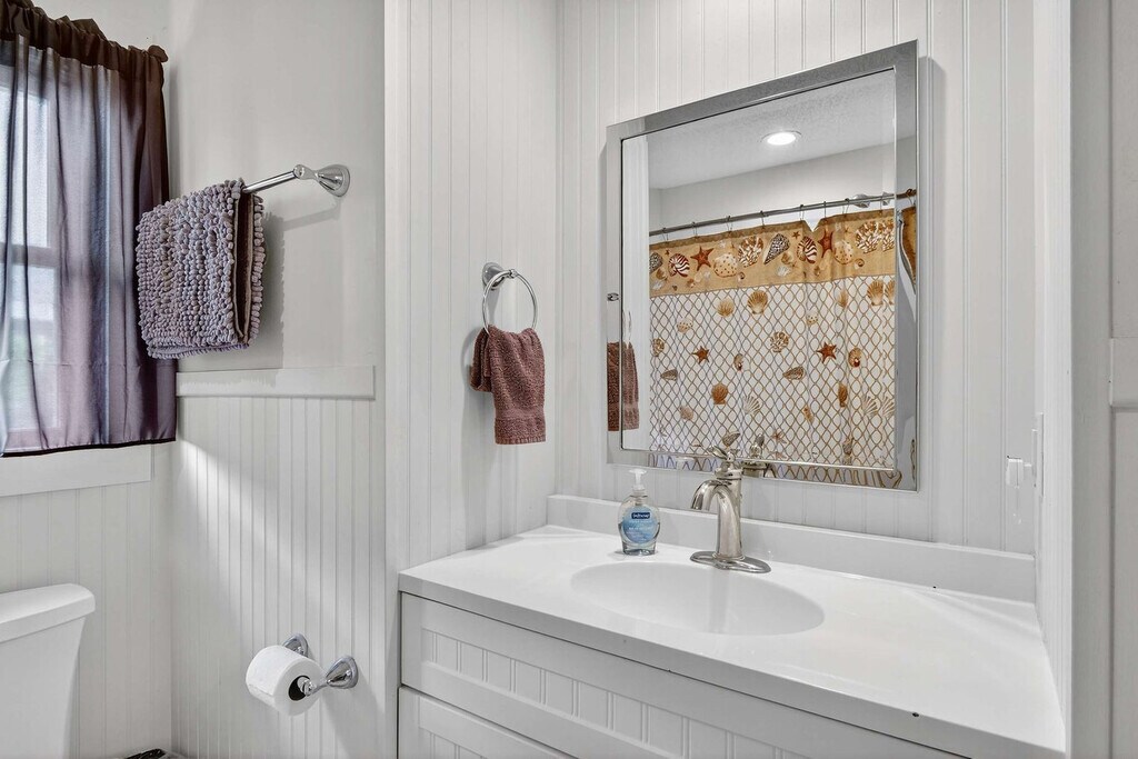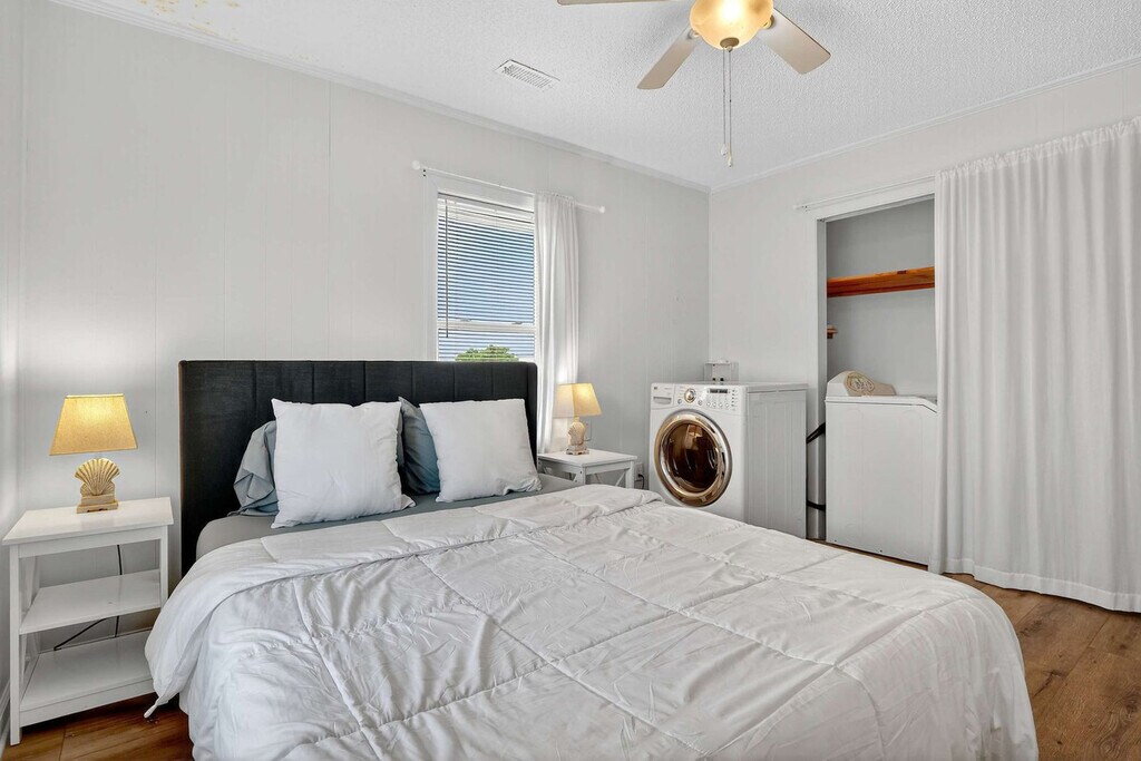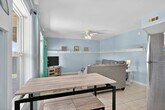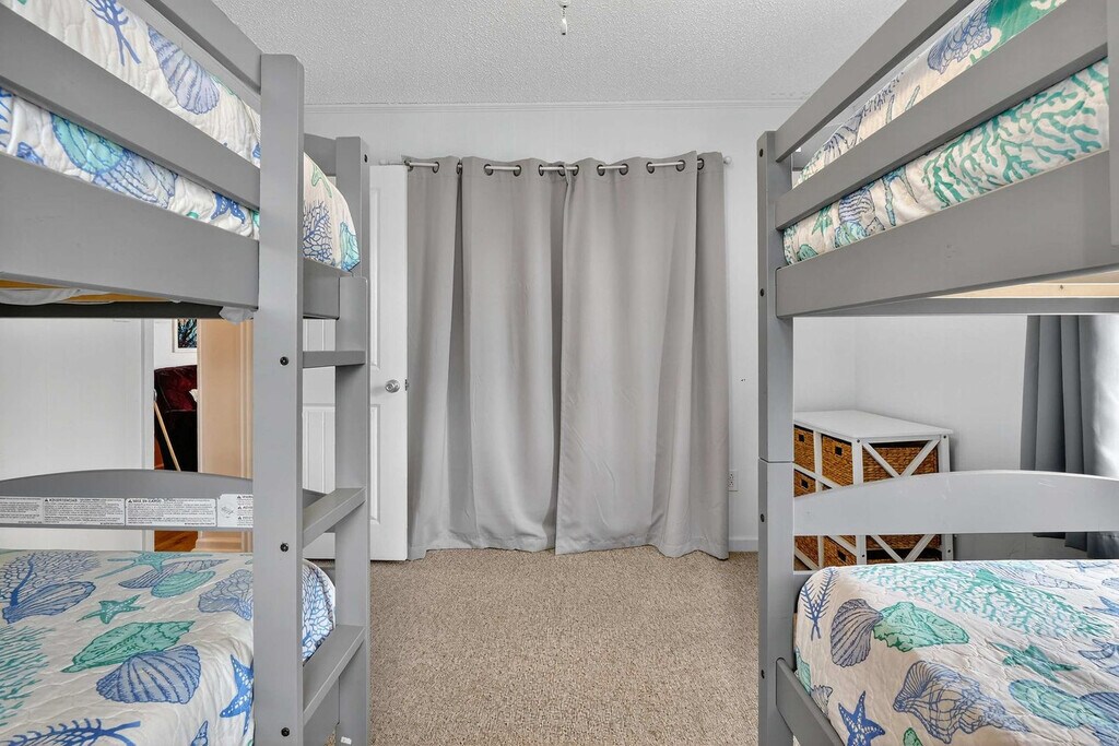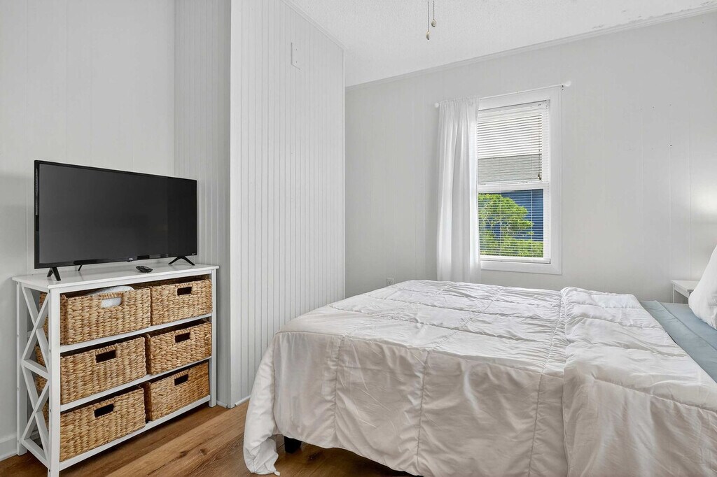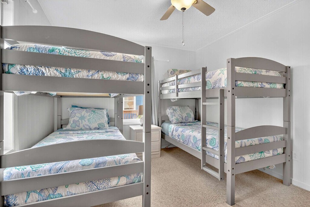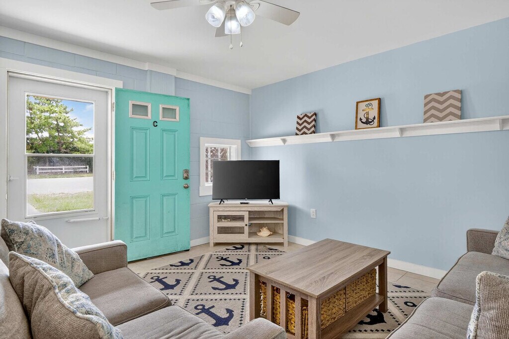 Welcome to your amazing South Topsail retreat! This ground floor 2-bedroom, 1-bathroom apartment is located less than 500 feet from beach access, offering brightly-painted pastel walls and comfy furniture. Enjoy blazing fast Wi-Fi and Roku smart TVs for your entertainment needs. The spacious master bedroom features a queen bed and a twin bed, while the second bedroom offers a functional bunk bed. The well-stocked kitchen includes a dining table for four, and outside, a great paved sitting area with a porch swing and extra seating awaits. This amazing South Topsail retreat offers everything you need for a memorable vacation. The ground floor apartment features brightly-painted pastel walls and comfy furniture, creating a cheerful and inviting atmosphere. Enjoy blazing fast Wi-Fi and Roku smart TVs for your entertainment needs. The well-stocked kitchen with a dining table for four is perfect for meals, and the living area boasts comfy couches and a 43" Roku smart TV. The master bedroom includes a queen bed and an additional twin bed for little ones, while the second bedroom has a functional bunk bed. A stack washer and dryer add convenience, and the full bathroom is equipped with essentials. Need more space? There are two other units in the building. Next door is an identically furnished 2-bedroom, 1-bathroom sister unit. Upstairs has 4 bedrooms and 2 baths and sleeps 10. Located less than 500 feet from the beach access and just a quarter mile from the S. Topsail Boardwalk, you will find yourself in the heart of relaxation and fun. South Topsail is a laid-back community with beautiful beaches and a family-friendly atmosphere. The downtown/boardwalk area offers shopping, restaurants, and ice cream, and nearby attractions include the Jolly Roger pier and the missile museum. Surf City is a short drive away, and Wilmington, with its museums, Battleship North Carolina, and Fort Fisher Aquarium, is just 40 miles to the south. Jacksonville is 20 miles to the north, and the apartment is close to LeJeune's south gate. Pets are not allowed and smoking is not permitted. The minimum age limit for this unit is 18. Children are allowed. The apartment offers ground floor access for easy entry.