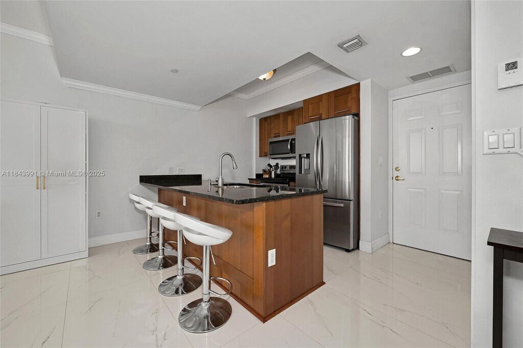 Welcome to One Village Place. This 2 bed, 2 bath unit features a den and 2 parking spaces. The open-concept kitchen has wood cabinets and black granite countertops. The split layout offers a den that can be used as a 3rd bedroom or office. The unit is bright and spacious with stainless steel appliances and granite countertops in the kitchen. It also has beautiful wood floors and a large master bedroom with 2 walk-in closets. Conveniently located close to the elevators, the building's amenities include a heated pool, fitness room, billiard room, 24/7 security, and jogging path. You can walk to the shops at Merrick Park and Landmark Theatres, and there's a trolley service to Miracle Mile
