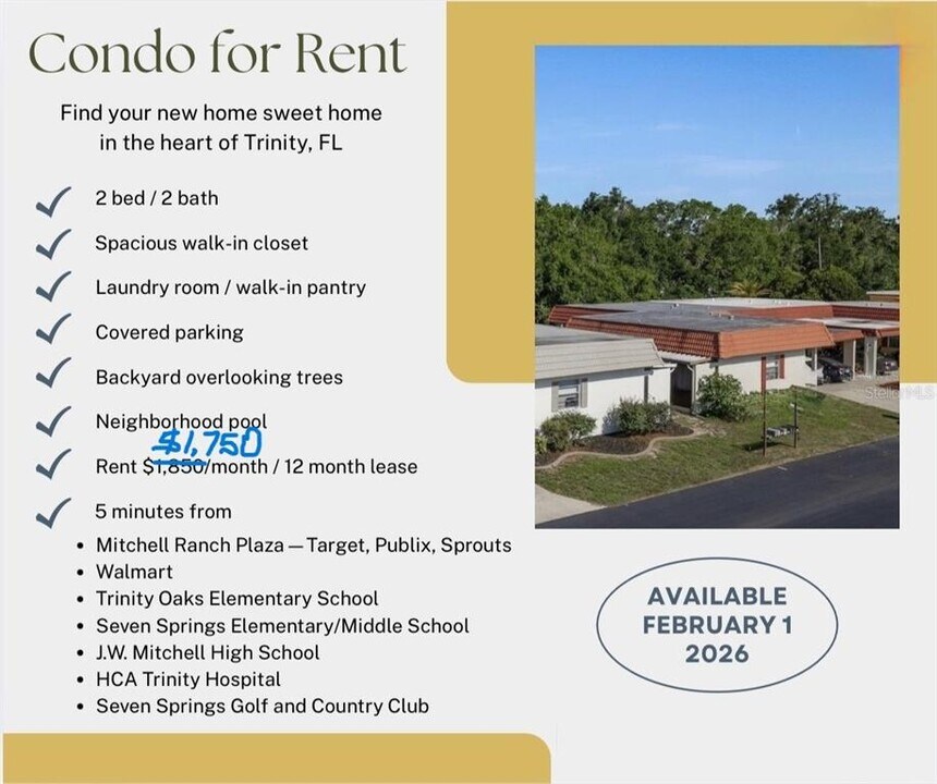 This beautifully updated 2-bedroom,2-bathroom condominium,perfectly situated in the heart of Trinity,FL. This move-in-ready unit combines modern upgrades with a serene setting. Key features of this home include: Newly Renovated Bathrooms: The home features modern,newly renovated bathrooms. Spacious Primary Suite Walk-in Closet: Ample storage is available with a walk-in closet in the primary bedroom. Walk-in Pantry/Laundry Room: The unit offers a convenient walk-in pantry which also serves as a laundry room. Private Enclosed Lanai: A serene outdoor space is provided by the private enclosed lanai,which overlooks lush trees and a tranquil canal. Community Amenities: The neighborhood includes a newly renovated community pool. The location offers exceptional convenience: Nearby Shopping: The home is just a 5-minute drive from Mitchell Ranch Plaza,which includes stores like Target,Publix,Sprouts,Walmart,HomeGoods,and Lowe's. Excellent Local Schools: The property is close to Trinity Oaks Elementary School,Seven Springs Elementary School,Seven Springs Middle School,and J.W. Mitchell High School. Community Hospital: HCA Trinity Hospital is also located within a 5-minute drive. Peaceful Neighborhood: Nestled in a quiet,family-friendly neighborhood,the location provides easy access to all Trinity and New Port Richey attractions. This move-in-ready property is ideal for those seeking comfort and convenience in a desirable area. MLS# TB8458754