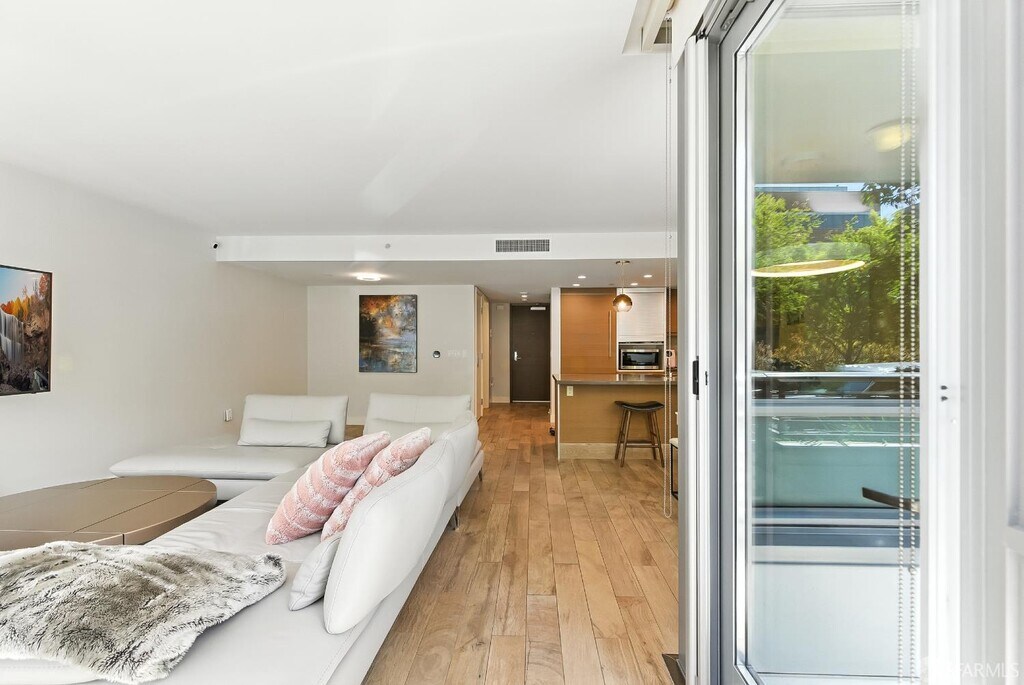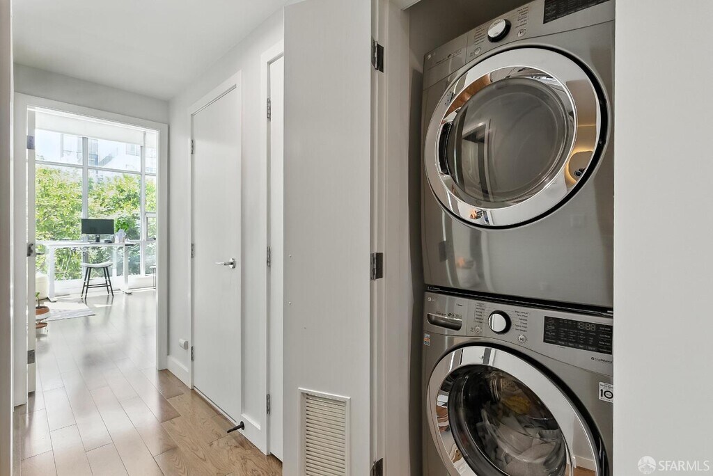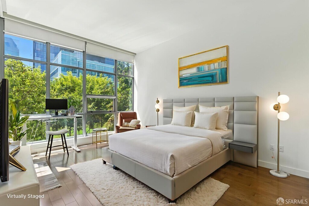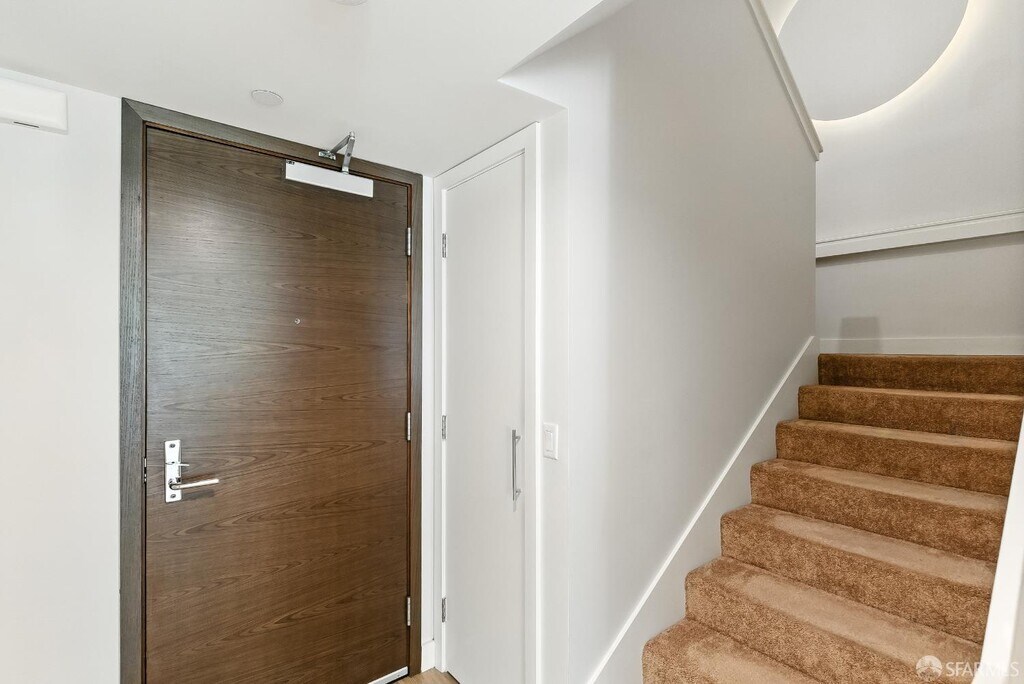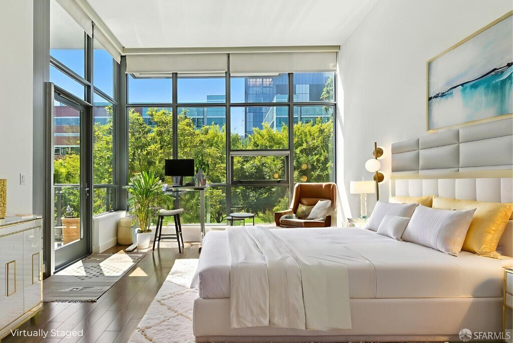 This rare 2 bed, 2.5 bath two-level condo at the Madrone offers approximately 1,635 square feet of modern living in one of Mission Bay’s premier luxury communities. With two private patios and a spacious floor plan, this residence blends comfort, style, and convenience in the heart of San Francisco’s vibrant waterfront neighborhood. Inside, soaring windows fill the home with natural light, while the open-concept kitchen is equipped with premium appliances including a Bosch stove, Bosch dishwasher, LG microwave, and Thermador fridge/freezer. Upstairs, the convenience continues with an in-unit LG stackable washer and dryer. Both bedroom suites are generously sized and include ample closet space. The primary bedroom includes an ensuite bathroom for added comfort and privacy. On the lower level, the half bathroom also features a large closet for extra storage — perfect for camping gear, boxes, suitcases, or sports equipment. Its open-layout, ground-floor quasi-townhome design with a private entrance combines the privacy and feel of a single-family home with the convenience of a full-service condominium building. The unit also comes with two custom built-in furniture pieces: a California Closet Murphy bed/desk/cabinet set and a Roche Bobois queen bed frame in the primary bedroom. Additional features include a mounted TV in the living room along with a Sonos base and sound bar system, as well as a central forced-air AC/heating system controlled by ecobee (Alexa compatible). Residents enjoy resort-style amenities, including a 75-foot heated lap pool, jacuzzi, fitness center, wet and dry sauna with shower/locker rooms, game room, private theater, BBQ pits, landscaped gardens, courtyard, conference rooms, and a resident lounge. Parking included. Utilities include water, garbage, compost, and recycling, while tenants pay for PG&E. Internet is currently provided free of charge via MonkeyBrains, though tenants may switch to another provider at their own expense. A floor plan is available upon request. Perfectly situated near Oracle Park, Chase Center, parks, restaurants, shops, and with easy access to freeways, this home offers the best of city living in a vibrant waterfront neighborhood. Available now. The home is offered as a one-year lease with the possibility to extend to two years. With its spacious floor plan, luxury finishes, resort amenities, and prime location, this residence stands out as one of the most desirable rental opportunities in Mission Bay.