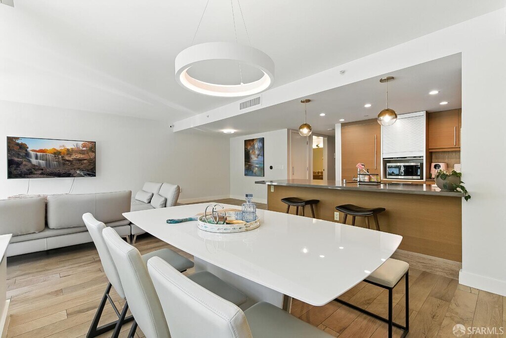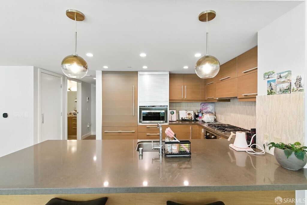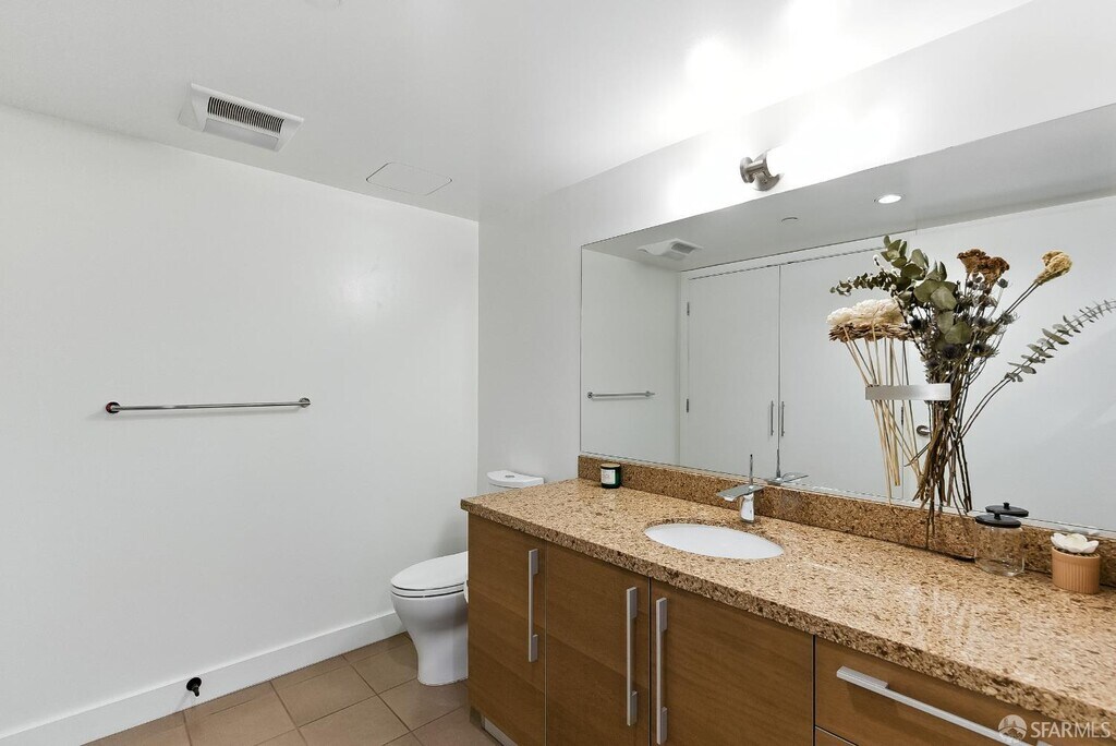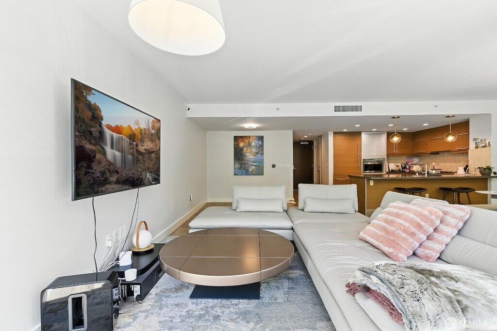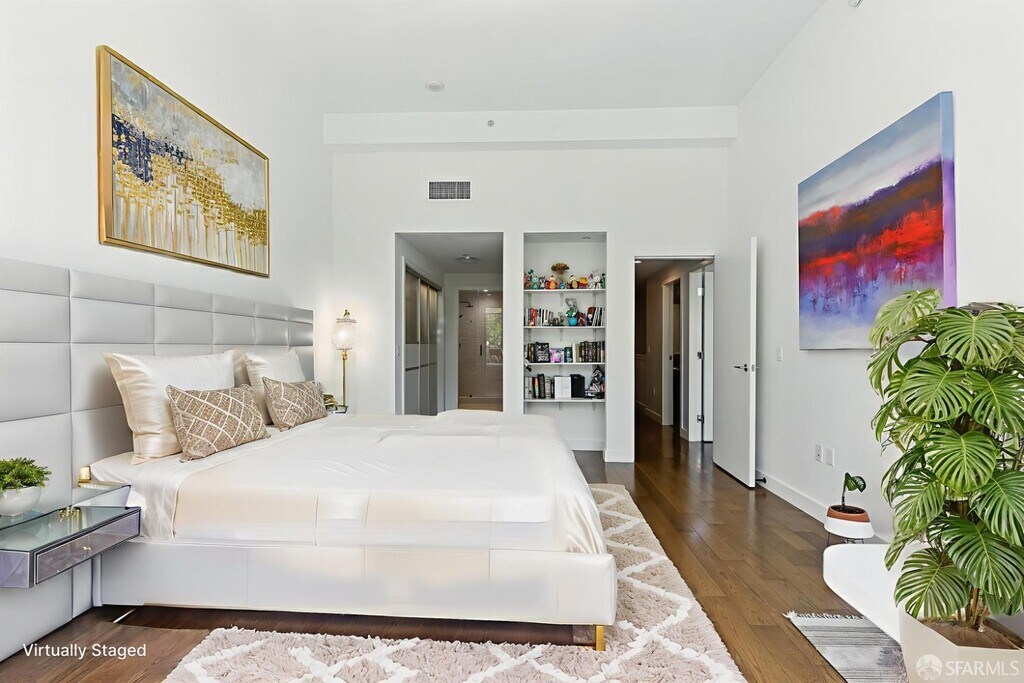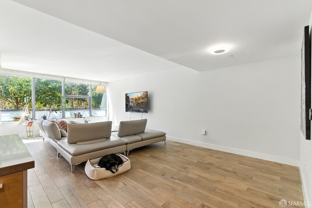 This rare 2 bed, 2.5 bath two-level condo at the Madrone offers approximately 1,635 square feet of modern living in one of Mission Bay’s premier luxury communities. With two private patios and a spacious floor plan, this residence blends comfort, style, and convenience in the heart of San Francisco’s vibrant waterfront neighborhood. Inside, soaring windows fill the home with natural light, while the open-concept kitchen is equipped with premium appliances including a Bosch stove, Bosch dishwasher, LG microwave, and Thermador fridge/freezer. Upstairs, the convenience continues with an in-unit LG stackable washer and dryer. Both bedroom suites are generously sized and include ample closet space. The primary bedroom includes an ensuite bathroom for added comfort and privacy. On the lower level, the half bathroom also features a large closet for extra storage — perfect for camping gear, boxes, suitcases, or sports equipment. Its open-layout, ground-floor quasi-townhome design with a private entrance combines the privacy and feel of a single-family home with the convenience of a full-service condominium building. The unit also comes with two custom built-in furniture pieces: a California Closet Murphy bed/desk/cabinet set and a Roche Bobois queen bed frame in the primary bedroom. Additional features include a mounted TV in the living room along with a Sonos base and sound bar system, as well as a central forced-air AC/heating system controlled by ecobee (Alexa compatible). Residents enjoy resort-style amenities, including a 75-foot heated lap pool, jacuzzi, fitness center, wet and dry sauna with shower/locker rooms, game room, private theater, BBQ pits, landscaped gardens, courtyard, conference rooms, and a resident lounge. Parking included. Utilities include water, garbage, compost, and recycling, while tenants pay for PG&E. Internet is currently provided free of charge via MonkeyBrains, though tenants may switch to another provider at their own expense. A floor plan is available upon request. Perfectly situated near Oracle Park, Chase Center, parks, restaurants, shops, and with easy access to freeways, this home offers the best of city living in a vibrant waterfront neighborhood. Available now. The home is offered as a one-year lease with the possibility to extend to two years. With its spacious floor plan, luxury finishes, resort amenities, and prime location, this residence stands out as one of the most desirable rental opportunities in Mission Bay.