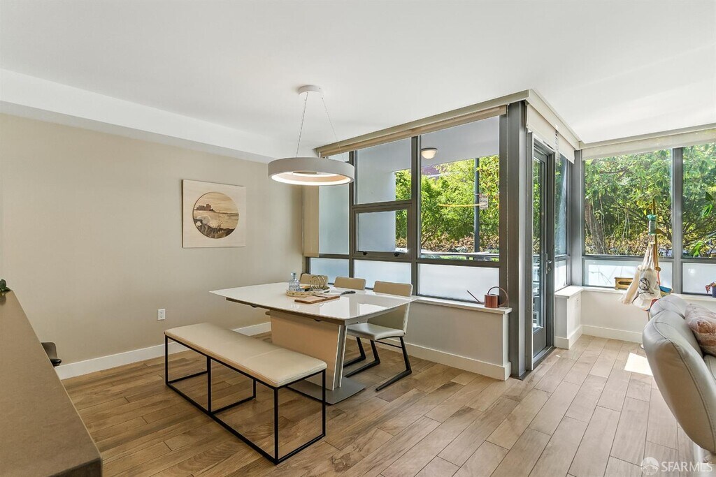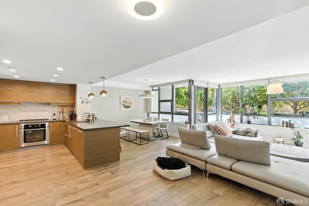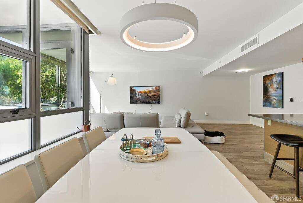 This rare 2 bed, 2.5 bath two-level condo at the Madrone offers approximately 1,635 square feet of modern living in one of Mission Bay's premier luxury communities. With two private patios and a spacious floor plan, this residence blends comfort, style, and convenience in the heart of San Francisco's vibrant waterfront neighborhood. Soaring windows fill the home with natural light, while the open-concept kitchen is equipped with premium appliances including Bosch stove/dishwasher, LG microwave, and Thermador fridge/freezer. Upstairs, an LG washer/dryer adds convenience. Both bedrooms are generously sized with ample closet space; the primary includes an ensuite bath. The lower-level half bath offers a large storage closet.Its open-layout, ground-floor design with private entrance blends single-family style living with condo convenience. Furnishings include a California Closet Murphy bed/desk set and a Roche Bobois queen bed frame. Extras include a mounted TV, Sonos sound system, and central AC/heating via ecobee. Residents enjoy a 75-ft heated lap pool, jacuzzi, gym, saunas, theater, BBQs, gardens, and lounge. Optional garage parking $450/month. Utilities include water, garbage, compost, and recycling; tenant covers PG&E. Internet via MonkeyBrains is included