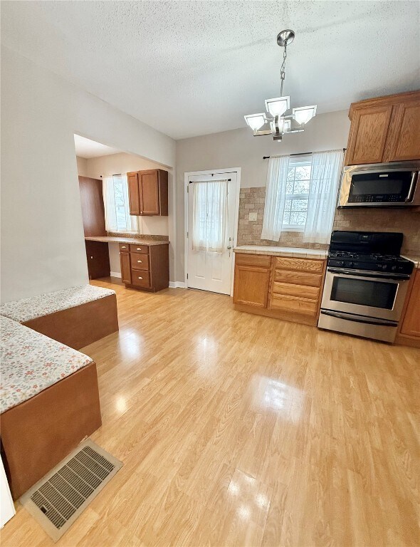 Two Bedroom Ranch Style House with Laminate Flooring Throughout Main Living Areas, 14 x 13 Living Room, 14 x 11 Kitchen Features Maple Cabinetry with Custom Tile Counter Tops and Backsplash, Appliances Include Gas Range, Garbage Disposal, Dishwasher and Refrigerator, Full Hallway Bathroom, 14 x 12 First Bedroom and 14 x 10 Second Bedroom, Full Hallway Bathroom, Second Hal Bathroom, Unfinished Basement, Off Street Parking with One Car Detached Garage, Available Now.