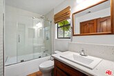 Fully contained 2 bedroom 2 bath Guest House with its own private entrance. Each bedroom is a master suite with its own attached bathroom. The bedrooms have wood flooring with tile in the bathrooms. The bedrooms are oversized approx. 14 X 14 (ocean facing) and 12 x 12 (mountain facing). Separate kitchen, laundry room and combined large living / dining area (28 ft long by 14 ft wide) and tile flooring. One bedroom, kitchen and living area have ocean views. Close to PCH and yet very quiet. 180 degrees of ocean views and sound of waves. Its a writers paradise quite and peaceful. The front has fantastic mountain views. This is unfurnished. Laundry room comes with clothes washer and dryer. Kitchen has newer stainless steel appliances, stove / oven, fridge and dishwasher.