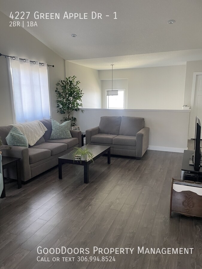 IN-SUITE LAUNDRY 2 Bedroom Condo in Regina – Available July 3, 2025 Key Details: $1650/month Rent, 2 Bedrooms, 1 Bathroom, 1 Parking Stall, No Pet Policy Mentioned - Tenant pays all utilities GoodDoors Benefits: - 24/7/365 Maintenance Hotline - Credit Building (Equifax) - Online Resident Portal - HVAC Filter Delivery - Customizable Tenant Insurance - Flexible Rent Payment Options - Security Deposit Waiver Program Property Description: - Welcome to your new home at 4227 Green Apple Drive! - This well-maintained 2-bedroom, 1-bathroom condo boasts a bright and spacious layout with plenty of natural light. - Perfectly located close to popular restaurants, shops, and essential services — everything you need is just steps away! Amenities: - In-unit: Washer and Dryer, Dishwasher, Microwave - Building: Not Mentioned - Outdoor: Not Mentioned Availability: Move-in date is July 3, 2025. Lease term not mentioned. Take Action: Don't miss out on this great opportunity! Visit our website to book a viewing or apply today. an open-concept layout with generous living space, large windows that fill the unit with natural light, and contemporary finishes throughout. The kitchen comes fully equipped with a microwave and dishwasher, making meal prep and cleanup a breeze. For added convenience, the unit also features an in-suite washer and dryer