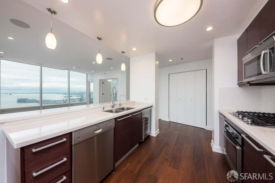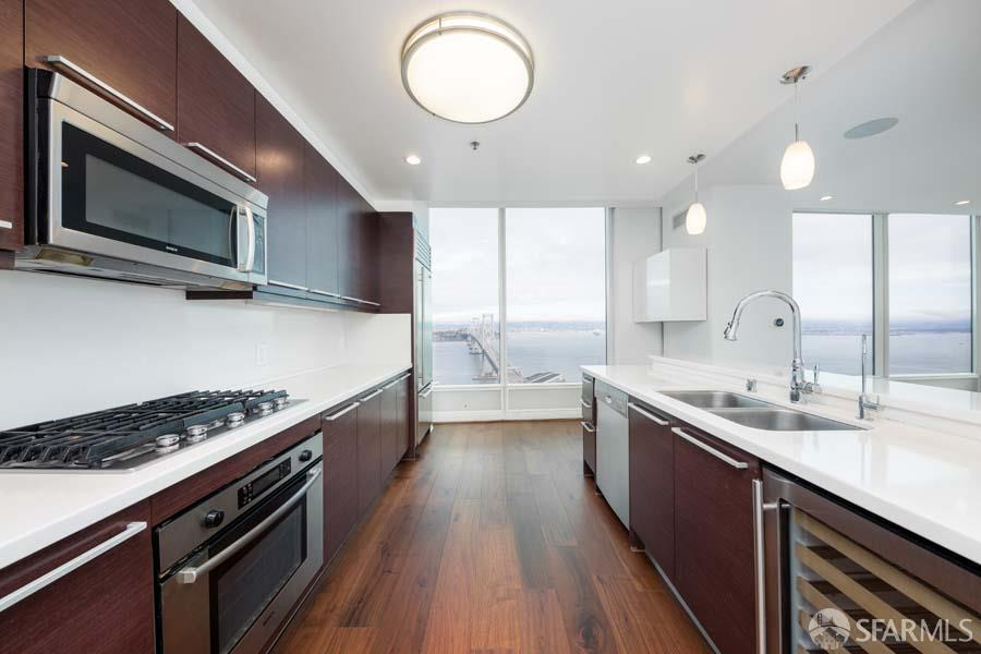 A truly rare sky residence at One Rincon Hill, this penthouse-level home showcases cinematic, unobstructed views of the Bay Bridge and the San Francisco waterfront from soaring 11.5-foot floor-to-ceiling windows. Bathed in natural light and elevated by custom designer upgrades, the residence blends scale, drama, and sophistication in one of the city's most iconic full-service towers. Thoughtfully customized, the home features bespoke lighting, a professional-grade theater system, and motorized blackout shades throughout. The expansive layout includes two substantial bedroom suites and a flexible junior room or den, perfectly suited for a private office, media room, or guest retreat. The sleek chef's kitchen is finished with Italian cabinetry and a Bosch stainless steel appliance suite, offering a polished and modern backdrop for daily living and entertaining alike. One valet, full sized parking space (text-requested, EV-compatible w/ ability to add up to 4 additional parking spaces) and a private storage cage are included. As a resident of One Rincon Hill, enjoy access to an unmatched suite of hospitality-driven amenities, including 24-hour valet, concierge, package and dry-cleaning services, a grand porte-cochre, heated lap pool and spa, two club-level fitness centers with locker rooms, elegant lounge spaces, secure storage, a dog relief area, and the renowned Uncle Harry's sky lounge. Offered for a one- or two-year lease at $24,995 per month, with parking, storage, and HOA dues included. Live life above it all! MLS # 426121721