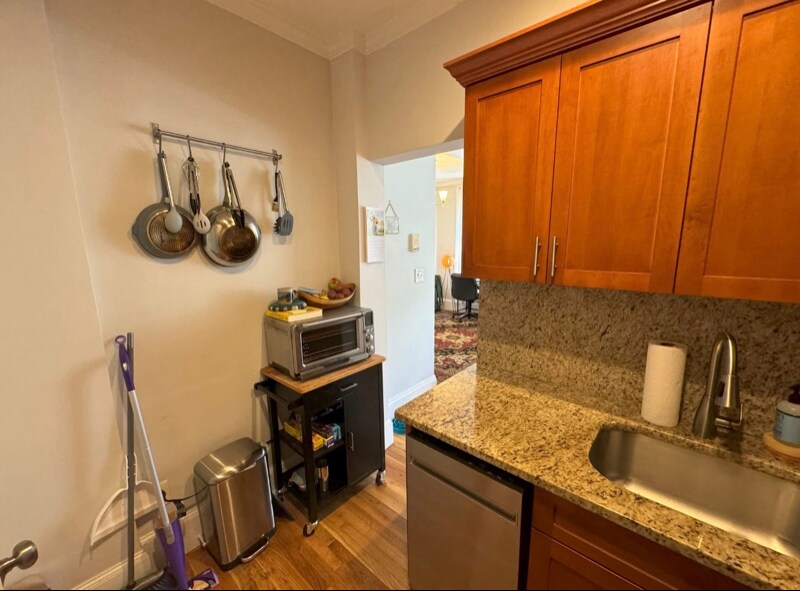 Top floor remodeled Brownstone unit featuring: - Hardwood flooring throughout! - Modern fully equipped kitchen! - Spacious bow front living room! - Generously sized primary bedroom! - Smaller 2nd bedroom or office! - 2 full updated tiled bathrooms! - Skylights & large windows!