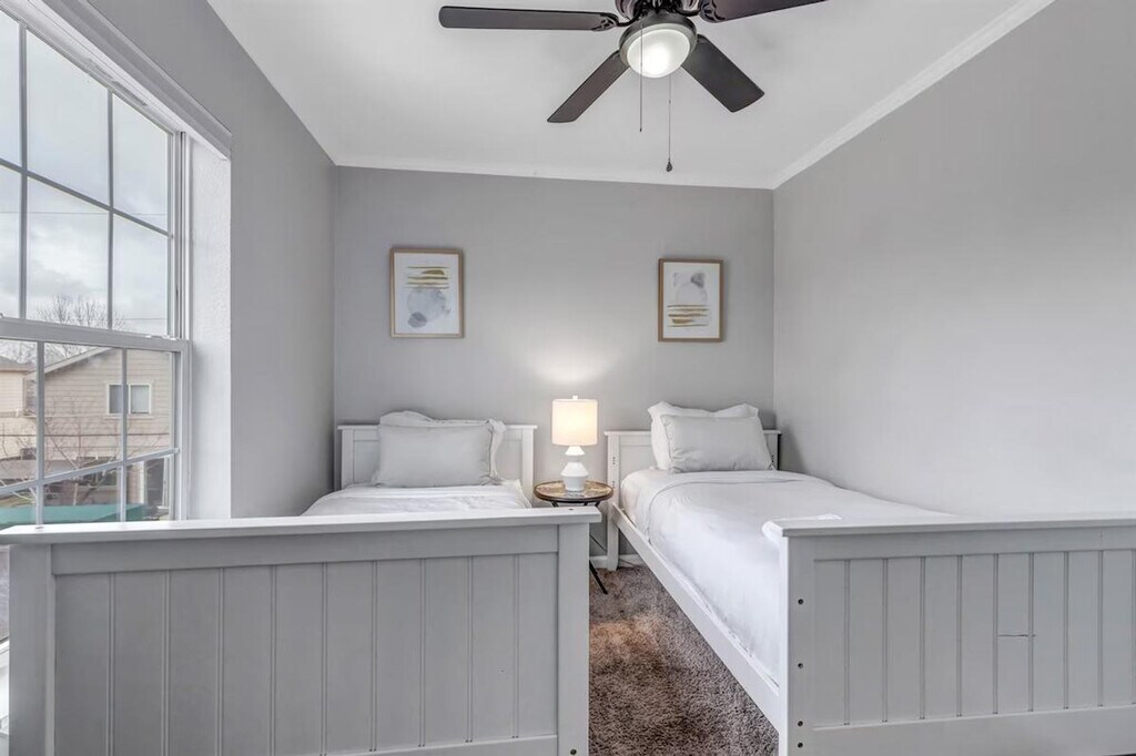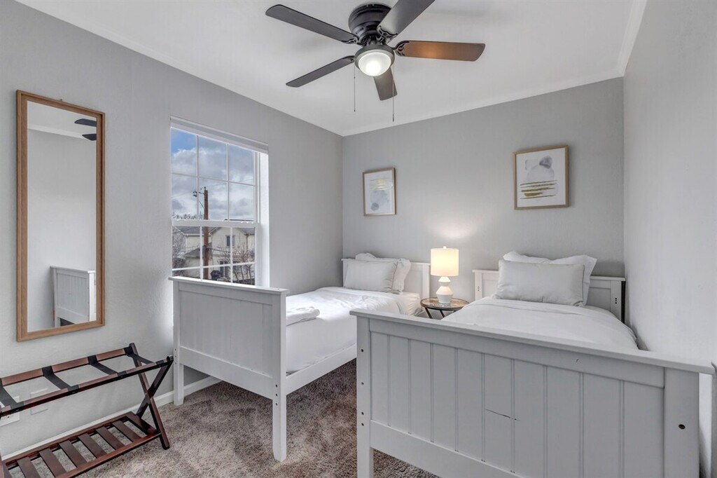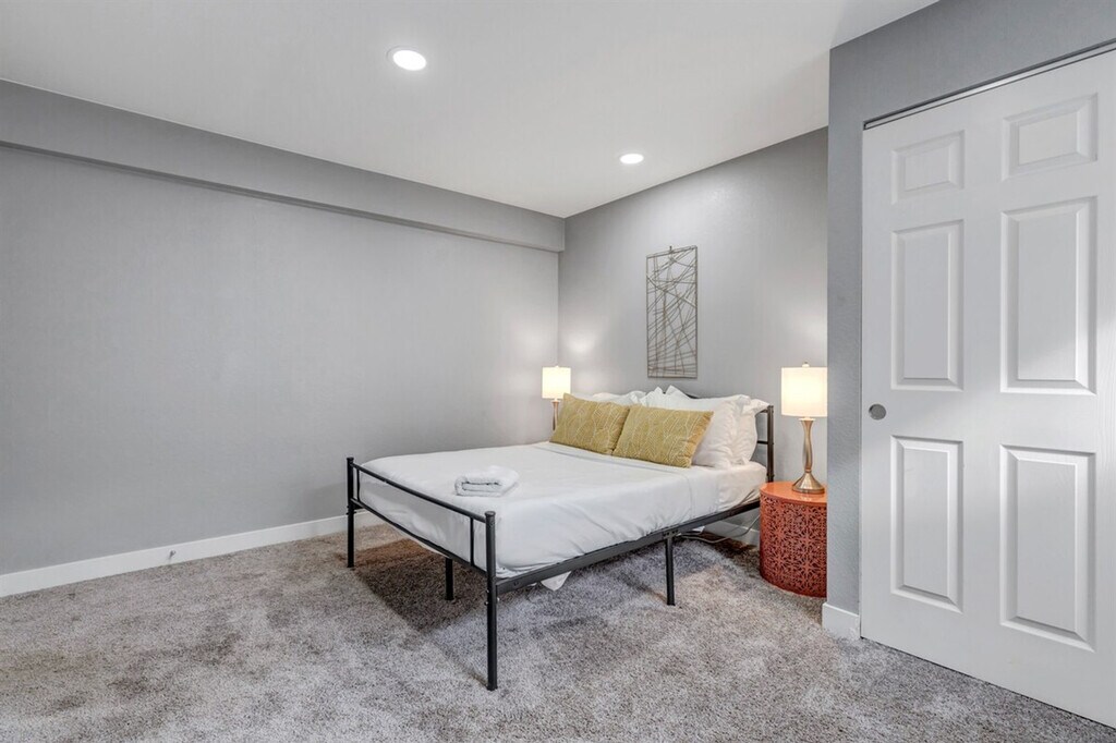 Feel at home in this centrally located 5-bedroom abode in Denver. This home is equipped with a full bar, game room, outdoor patio, and fire pit. The open and bright space is perfect for large group gatherings. Relax on the leather wrap-around couch and watch the 75" TV. The connected kitchen area allows you to cook while engaging with the group. Clink glasses at the bar and enjoy meals together. The oversized master bedroom features a king-size bed with a luxury cashmere top mattress, a mounted TV, an oversized closet, and an attached private bath. Two additional bedrooms upstairs have queen-size luxury mattresses. In the basement, you'll find a game room and bar set-up with a full bar, a 55" mounted TV, foosball, and an arcade game. There are also two bedrooms in the basement with queen-size luxury mattresses. The oversized patio includes 6 comfortable padded chairs and a fire pit. This home is 420 friendly, but please keep it outside and in the back of the home. Located minutes from multiple downtown areas and 2 blocks from the train station, this home provides easy access to trendy Tennyson St, Old Town Arvada, and Denver. Guests have access to the entire home, which is a duplex, and the private backyard. [SI]