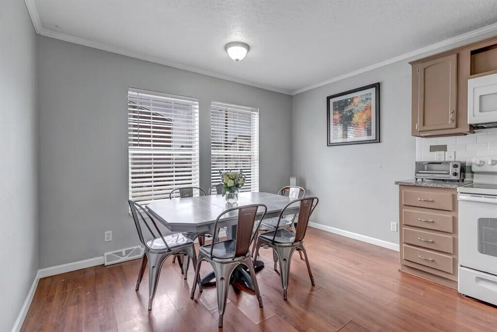 Feel at home in this spacious 5-bedroom home, located just 10–15 minutes from Downtown Denver, Coors Field, Mile High Stadium, and Union Station. Perfect for families, groups, and business travelers, this home is also within walking distance of Tennyson St and Olde Town Arvada shops and breweries. This modern, roomy home features an open layout, reclining sofas, and a 75” smart TV. The fully stocked kitchen connects to the dining area with seating for 10. The finished basement offers extra privacy. Amenities include fast Wi-Fi, air conditioning, free parking, and laundry. The backyard is fenced in and includes a propane grill. The pet-friendly fenced yard is available for those traveling with pets. The garage is available if storage or motorcycle parking is needed. The Mile High Abode is ideally located for exploring Denver and its surrounding areas. The home is a duplex with a huge, private fenced-in yard and garage. [SI]