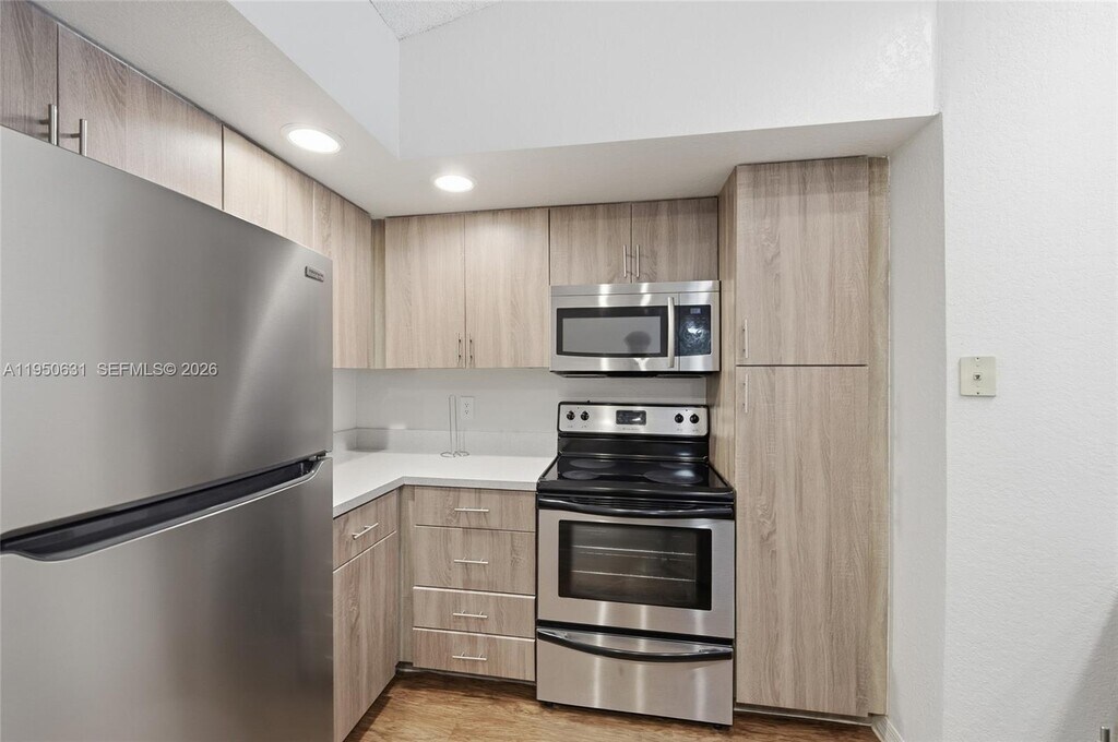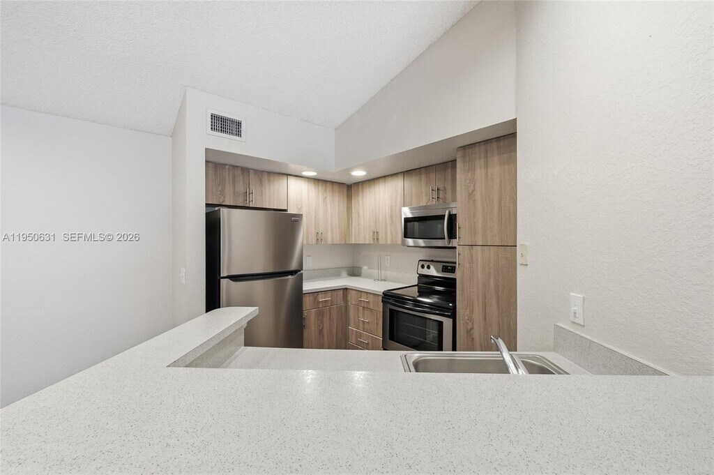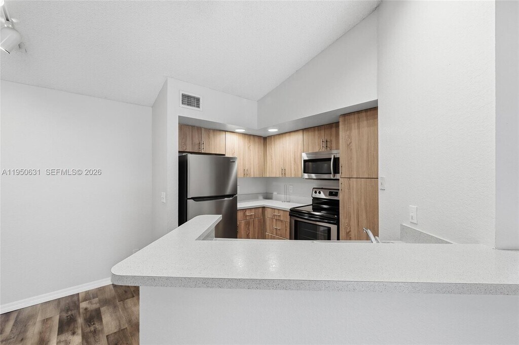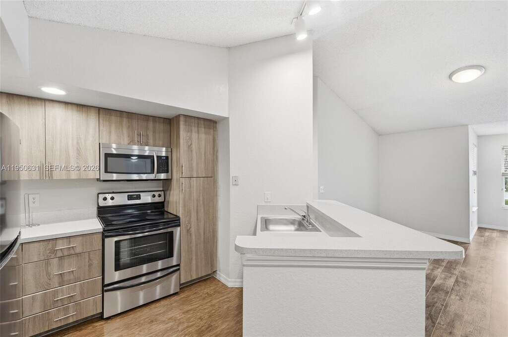Beautifully Upgraded Oversized 1-Bedroom, 1-Bath Condo Nestled In The Resort-Style Community Of Isles At Lago Mar. Open-Concept Kitchen Featuring Newer Stainless Steel Appliances, Upgraded Cabinetry Hardware, Stylish Track Lighting, And A Convenient Breakfast Bar. Spacious Open-Concept Living And Dining Area Featuring Vaulted Ceilings And Newer Wood Flooring Throughout The Main Living Spaces. The Primary Bedroom Suite Offers A Walk-In Closet, Wood Blinds, And A Generously Sized Bathroom With A Linen Closet, Newly Tiled Shower, Upgraded Mirror And Lighting Fixtures. A Dedicated Utility Room Includes A Full-Size Washer And Dryer For Added Convenience. Enjoy An Array Of Community Amenities, Including Pools, Fitness Center, Tennis Courts, And More. HOA Includes Water, Sewer, And Trash. Ideally Located Near Sawgrass Mall, American Heritage School, Golf, Shopping, Dining, Entertainment, And Major Highways. A Must-See! MLS # A11950631