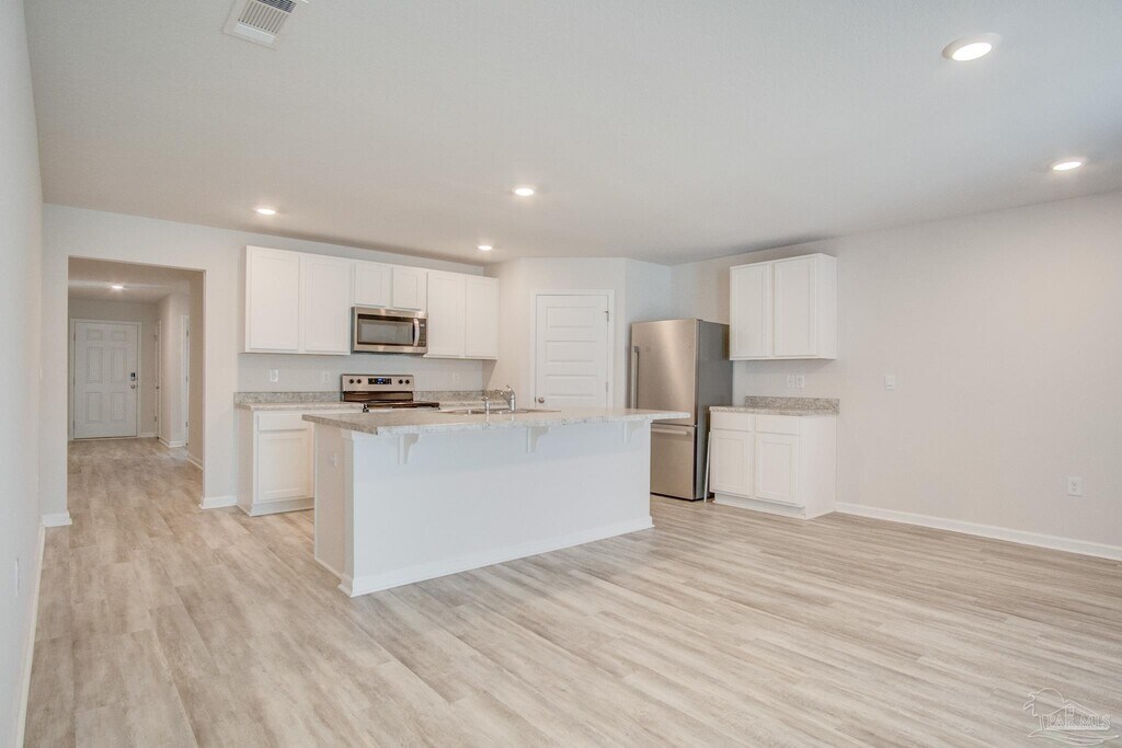 Nicole St. AubinStunning nearly-new 4-bedroom, 2-bath home in the vibrant Woodlands subdivision of Pace, complete with solar panels, top-rated schools, and a prime location near shopping, dining, and I-10. From the covered front porch and landscaped flower beds to vinyl plank flooring throughout the main living areas, this home combines style and function. The open-concept layout features a bright modern kitchen with white cabinets, laminate counters, stainless steel appliances, a center island, and a spacious pantry that flows seamlessly into the dining and living areas perfect for entertaining or everyday living. The primary bedroom offers a walk-in closet and a spa-like en suite with a double-sink vanity, a walk-in shower, and extra storage. Three additional bedrooms share a sleek full bath. Step outside to the fully fenced backyard with a covered patio, and enjoy neighborhood amenities including walking trails, a splash pad, a playground, a sports field, gazebos, and swings. Residents are required to have renter liability insurance, which can be added for $11.95/month, or you can opt into the Resident Benefits Package (RBP) for $45/month, which includes renter liability insurance, HVAC air filter delivery, and on-demand pest control. Pet-friendly with owner approval ($250 non-refundable pet fee per pet; aggressive breeds excluded). Coming Available March 13th.. Currently Occupied Please Do Not Disturb Residents