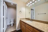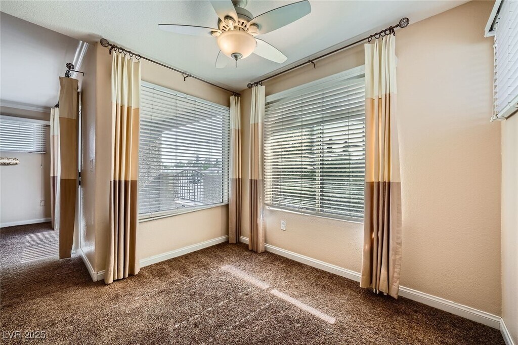 This 2-bedroom condo in the Borgata Community has a separate upstairs entrance. The living room includes natural light, a balcony, and a dining area. The kitchen features granite counters and stainless-steel appliances. The bedrooms are equipped with ceiling fans and walk-in closets. The guest bathroom has a roman tub, and the primary suite includes a large shower; both bathrooms have granite countertops. The community offers amenities such as a pool, spa, and gym. It is conveniently located near various attractions in Las Vegas.