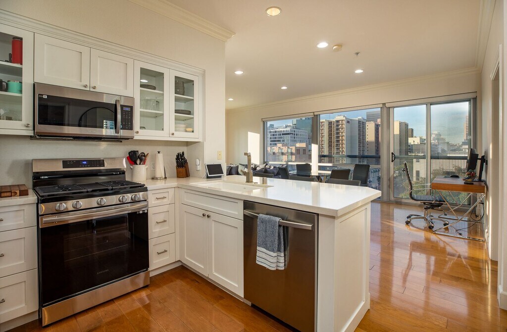 This rare,fully furnished corner unit,filled with natural light,is exquisitely upgraded and remodeled. It’s a spacious 2 bedroom,2 bath condo in the heart of the Gaslamp. This unit has it all! Sweeping city views,wood flooring throughout,quartz counters,stainless steel appliances,in-unit washer and dryer,2 secured parking spaces,and much more. The optimal location is within walking distance to endless dining options,entertainment,and nightlife. Building amenities include a pool,spa,courtyard,BBQ,community room,and fitness center. Perfect for those seeking to immerse themselves in urban living. MLS# 250044674