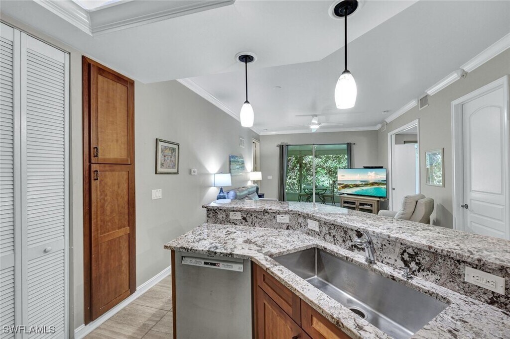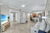 Turnkey 2-Bedroom Beach Retreat – Walk or Bike to Bonita Beach! This stunning first floor,2-bedroom,2-bathroom condo offers the ultimate in flexibility,style,and coastal living. Completely renovated and move-in ready,this property is offered fully furnished,so all you need to do is pack your suitcase and start enjoying the Florida lifestyle. The residence features a spacious layout with a beautifully redesigned kitchen boasting custom wood cabinetry,granite countertops,a breakfast bar,and coastal-inspired tile throughout. Crown molding,designer furnishings,and a large screened-in lanai with built-in grill and refrigerator create the perfect space for relaxing or entertaining with a peaceful wooded backdrop. A detached 1-stall garage is included for added convenience & storage. Amenities include a community pool,Tiki hut,BBQ grills,and a community rooftop deck to capture Bonita's breathtaking sunsets. Located in a highly desirable area close to restaurants,shopping,marinas,and more. Available immediately.