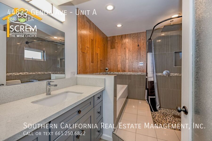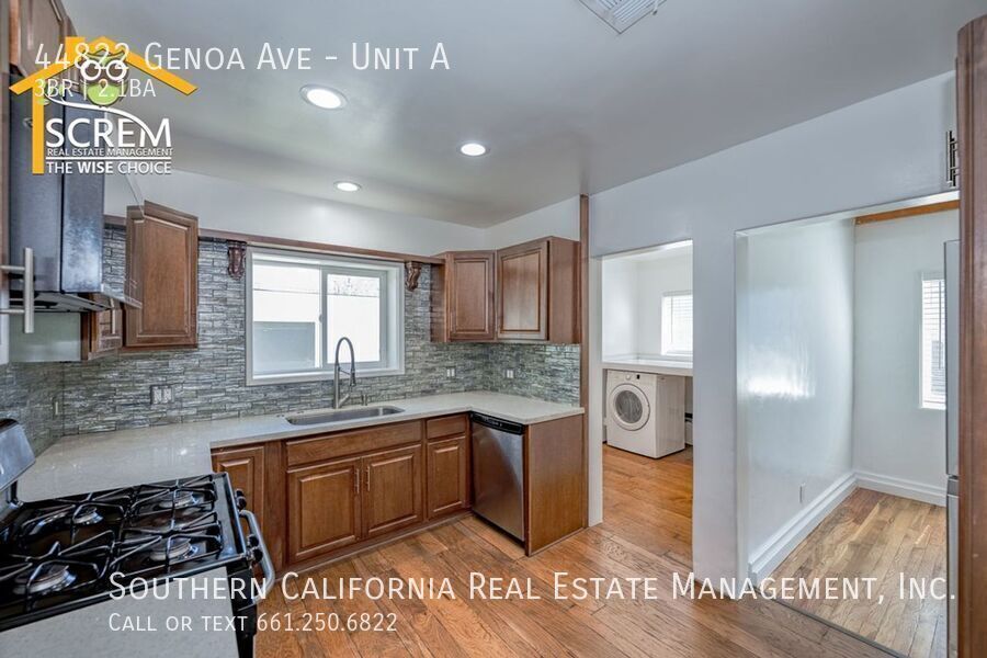 Beautifully updated single-story home located in Palmdale. This property features three bedrooms tucked behind a private gated entrance. As you step inside, you'll be greeted by a spacious living room brimming with character. The soaring wood beamed ceilings, rich wood flooring, elegant wall sconces, and a cozy updated fireplace with a classic mantle. The dining area seamlessly connects to an updated kitchen, with designer tile backsplash, quartz countertops, sleek cabinetry with brushed silver hardware, and stainless steel appliances, including a gas stove, single oven, microwave, dishwasher, and refrigerator. Two generous guest bedrooms feature wood flooring and share a convenient Jack-and-Jill bathroom equipped with a modern vanity and a walk-in shower. The primary suite boasts an oversized mirrored closet and built-in shelving. The ensuite bathroom has been tastefully updated with a walk-in shower, a separate soaking tub, and a stylish vanity. Additional highlights of the home include a beautifully updated half bathroom, a dedicated laundry room complete with a dryer and utility sink, and a secure gated entry for added privacy. Water and trash are included in the rent. *Owner may consider a small pet. *Please note that on the same lot there is a two-bedroom home available for rent. For inquiries about this property, please email . To schedule a viewing appointment, visit