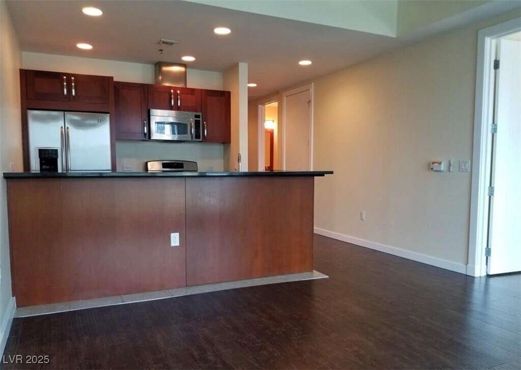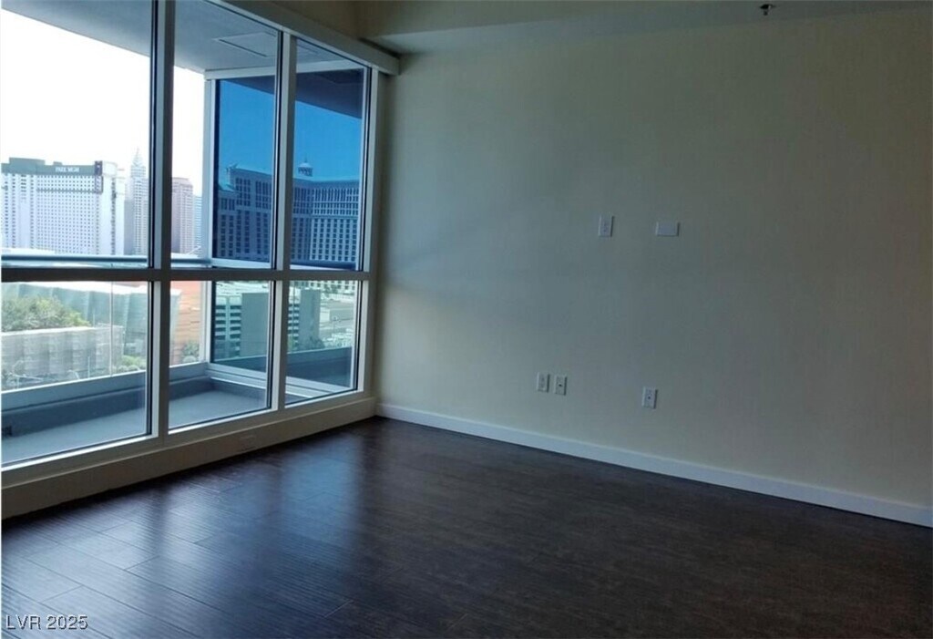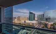 Most popular floorplan, 1 master bedroom with a den, 1.5 baths. All hardwood floor and motorized window shades throughout. Free Cox cable TV and Internet. Kitchen features marble flooring, granite countertops, and stainless steel appliances. Fitness center with spa and steam room, valet, swimming pool house limousines service. All located within minutes of the Strip. Absolutely Stunning!