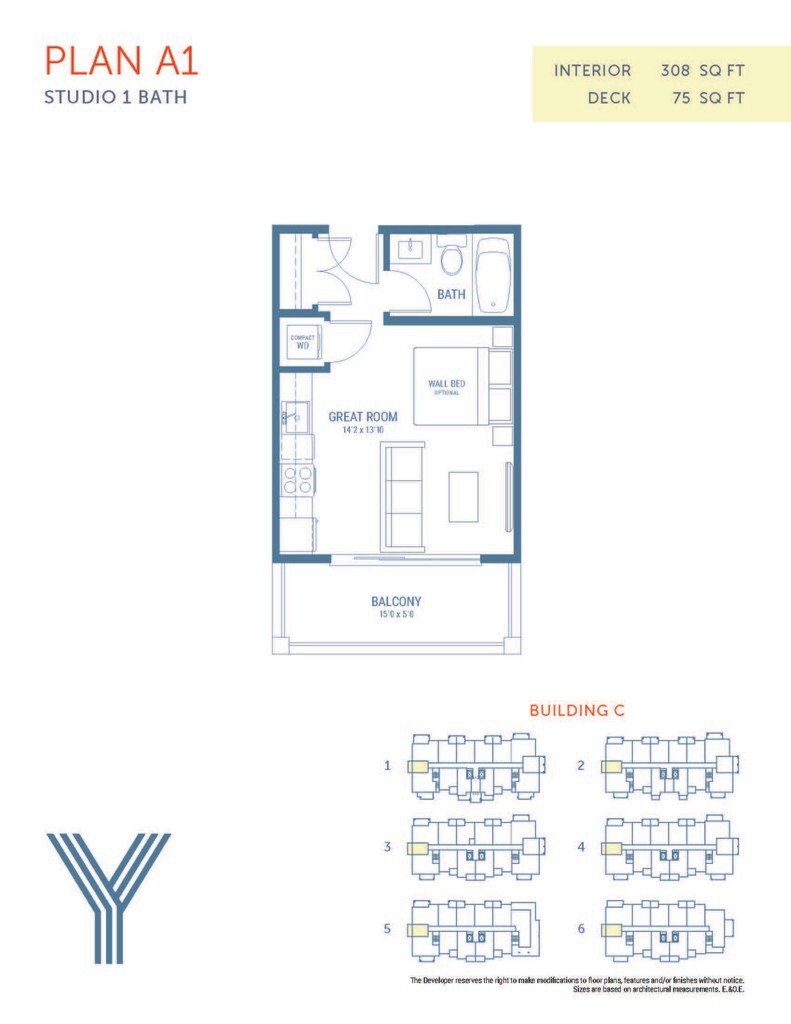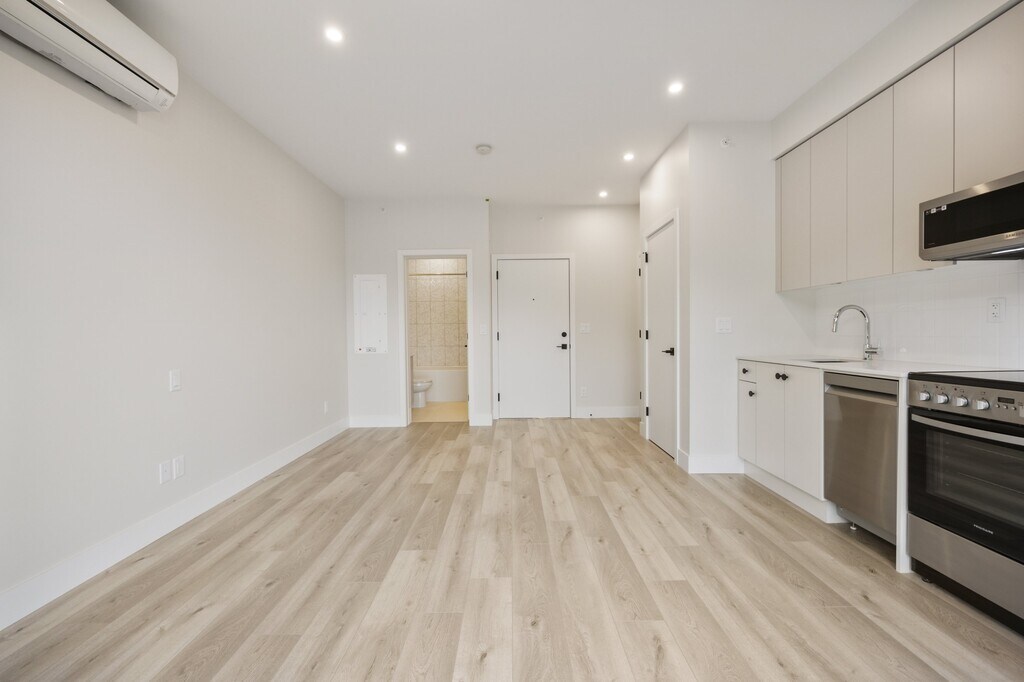 Welcome to Unit 304 at York, a bright and efficiently designed studio-style 1 bedroom home located on the 3rd floor of a modern 6-floor building. This thoughtfully crafted layout offers a spacious open living area, contemporary finishes, and a seamless indoor–outdoor flow. The open great room provides flexible space for living, dining, and working, while the semi-separated bedroom area offers privacy without sacrificing openness. The modern kitchen features full-size appliances and a functional island layout, and the in-suite compact washer/dryer adds convenience to your daily routine. Step outside onto your large private deck (136 sq. ft.), perfect for relaxing, enjoying fresh air, or entertaining. A built-in heat pump provides efficient heating and cooling year-round, ensuring comfort in every season. Suite Highlights: Studio-style 1 bedroom layout Located on the 3rd floor of a 6-floor building Large private deck for outdoor living Open great room with a versatile, bright layout Full kitchen with modern appliances + island In-suite compact washer/dryer Heat pump for efficient heating & cooling Clean, contemporary finishes throughout Disclaimer: Photos and floor plans may not be of the exact unit. Layout, orientation, and finishes may vary slightly.