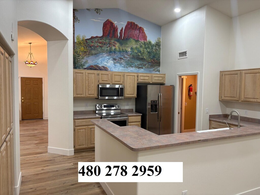 Beautifully Renovated 3-Bedroom Home in the Heart of Gilbert This spacious, newly refreshed 2,105 sq ft single-level home offers 3 bedrooms and 2 full bathrooms in a highly desirable Gilbert neighborhood, directly across from a community park. Recent updates include: Fresh interior paint Brand-new modern wood-look luxury vinyl plank flooring Renovations are currently underway, with the kitchen being upgraded to achieve a more modern, contemporary look. The thoughtfully designed split floor plan features vaulted ceilings, an open and airy feel, and two separate living areas, providing flexible space for everyday living or entertaining. The home also includes a 3-car garage with built-in cabinetry, offering excellent storage and functionality. Adding a unique and welcoming touch, two hand-painted wall artworks inspired by Sedona bring warmth, natural charm, and a serene ambiance to the home. Step outside to a landscaped backyard with grass, mature trees, and a covered patio, creating a peaceful and private outdoor retreat. A neighborhood park is conveniently located directly in front of the home. Flexible lease terms available — short-term and long-term leases from 5 to 18 months are welcome. With its prime location, spacious layout, and modern upgrades, this home offers comfortable living just one mile from downtown Gilbert.