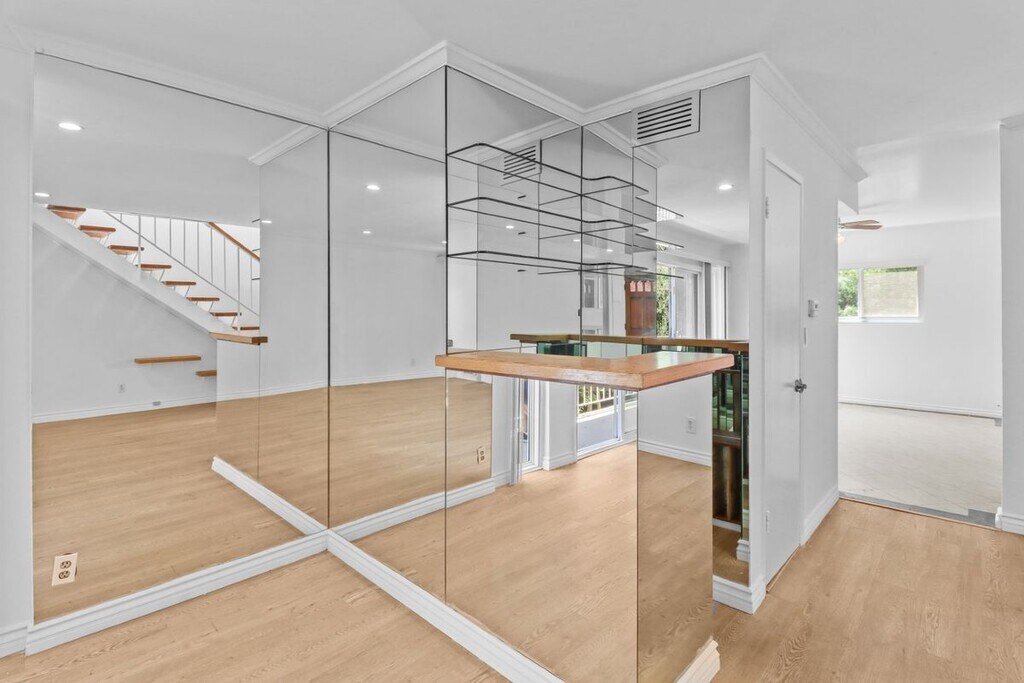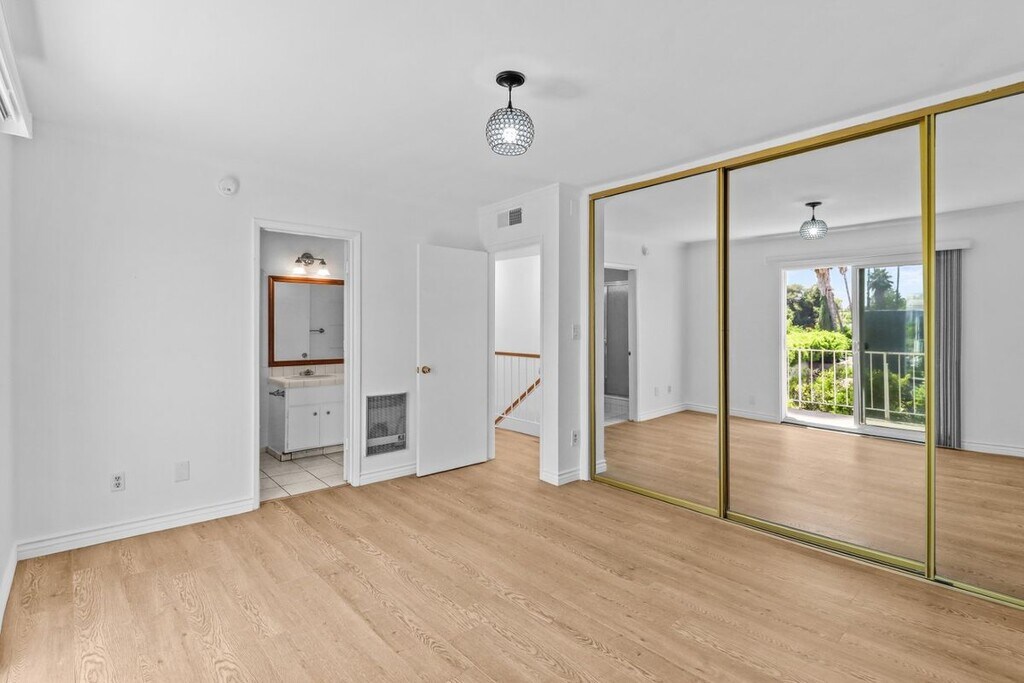 This stylish and updated two story townhome offers a blend of modern comfort and spacious functionality with recessed lighting throughout first floor. It's open floor plan living, dining and built in bar with 1/2 bath for guests opens onto a wrap around balcony which flows seamlessly through to the kitchen and breakfast area. Rich hardwood floors flows throughout the main floor. The updated cabinetry in the kitchen includes granite countertops and backsplash with stainless steel refrigerator and oven/range with a black dishwasher which offers a two tone effect against the white cabinetry. Off the kitchen is a new stacked washer & dryer ( one pictured is original one). The floating staircase adds to the open floor plan as you ascend to the 3 bedrooms upstairs. The central hall and bedrooms have laminated flooring. The master bedroom opens onto the balcony with views of the city lights along Ventura Blvd and also the treetops of the hills south of the Blvd The master bathroom has a large walk in shower and mirror over the sink. The other two bedrooms have similar views and the hallway bathroom has a full tub with shower on tiled floors. The condo project has a community pool, BBQ area and deck area for lounging as well as a community laundry room, if needed for those extra loads of laundry. Unit comes with a 2 car tandem parking in a gated subterranean garage which leads directly into the complex. Condo building is located less than 1/2 block from Ventura Blvd with it's shops and Sherman Oaks Galleria, Whole Foods and many more shopping and eating spots. MLS# 25570559