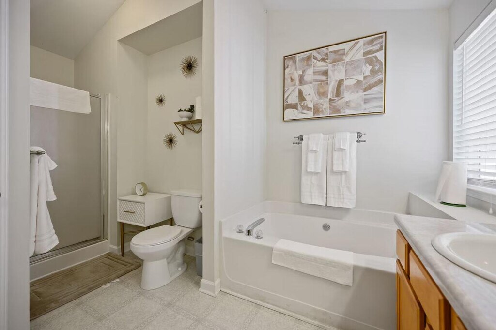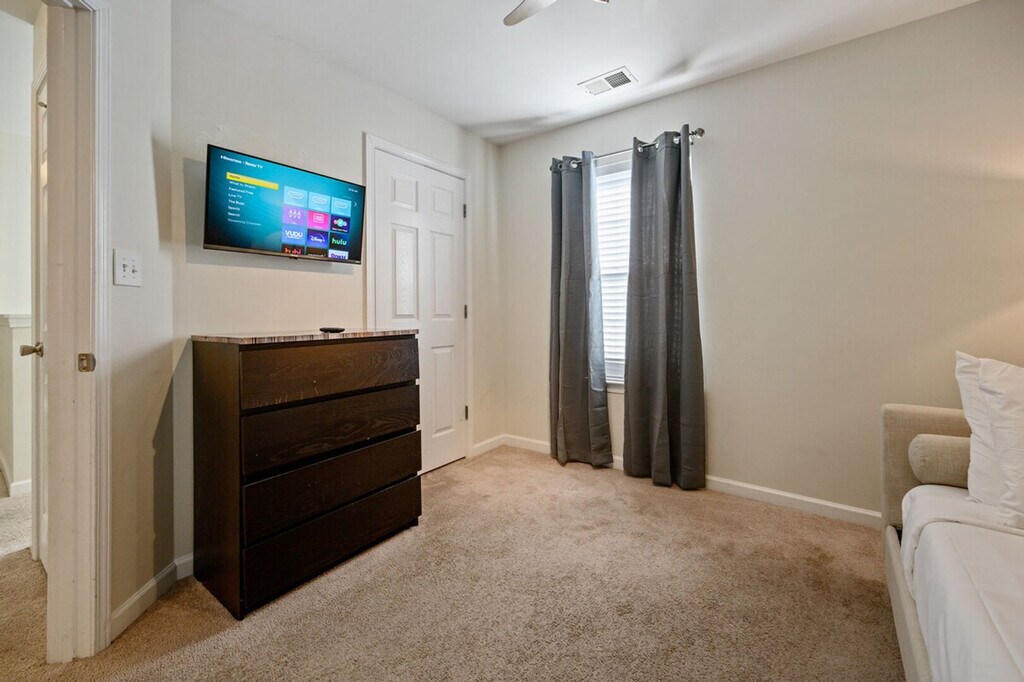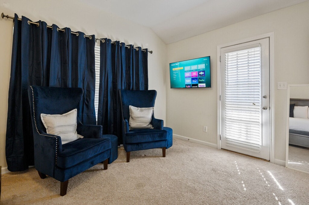 Feel at home in this fully furnished 3-bedroom, 2.5-bath home in Acworth, GA. This two-level home is perfect for families, long-term guests, and traveling professionals alike! This home features a king-size master suite with private patio access and a smart TV, a queen bedroom with a smart TV, and a twin bedroom with a smart TV. There are two full bathrooms upstairs and a half bath on the main floor. Enjoy a cozy family room with a large smart TV, a modern kitchen with stainless steel appliances and cooking essentials, a dining table for six, and a breakfast bar for three. High-speed Wi-Fi is available throughout. There is also a fenced patio, perfect for morning coffee or winding down at sunset, and a washer and dryer for guest use. A welcome basket with snacks and Keurig K-Cups is provided. Parking is available for one vehicle on the right side of the shared driveway, and street parking is available for additional vehicles. With LakePoint Sporting Center, lakes, parks, and trails just minutes away, this home is close to Lake Allatoona and Lake Acworth for fishing, kayaking, and boating, Galts Ferry Day Use Area, McKinney Campground, and Logan Farm Park and Dallas Landing Park. This is a non-smoking property, and events are not permitted. Pets are not allowed, but service/ESA guests must contact us before booking. A mid-stay clean is required for stays of 40–60 nights (linens and toiletries replenished; personal belongings not included). Scheduling is flexible, and guest presence isn’t necessary. For stays over 60 nights, a Deep Clean replaces the standard checkout clean and is more comprehensive for long stays. The standard cleaning fee charged at booking only covers the initial checkout clean. Any mid-stay clean, deep clean, restocking, or extra inventory requests are charged separately, on top of that fee. For bookings, any charges above the standard cleaning fee will be collected after confirmation or once stay thresholds (40/60 nights) are reached.