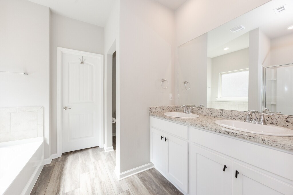Split-floor plan on a waterfront lot in a community loaded with amenities! An inviting open layout connects the living room, kitchen, and breakfast area, highlighted by a wall of windows that brings in tons of natural light. The kitchen offers granite countertops, stainless steel appliances (including a gas range), and a corner pantry. Enjoy 9-ft ceilings throughout. Luxury vinyl plank flooring extends through the main living areas and primary bedroom, with carpet in the three guestrooms. The primary suite features dual vanities, a separate shower, and a relaxing garden tub. The three additional bedrooms share a full bathroom off the foyer. Outside, you’ll appreciate the fully fenced backyard and peaceful waterfront views. Front & rear security cameras, a doorbell camera, and an active security system are already installed for added peace of mind. Community perks include a neighborhood pool with splash area, playground, walking paths, and picnic pavilion. Refrigerator remains. Some pets considered (max 2) with a $400 non-refundable fee per pet (under 25 lbs) or $500 per pet (26–50 lbs) + $25/month per pet.