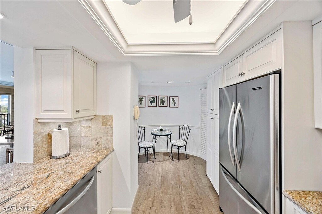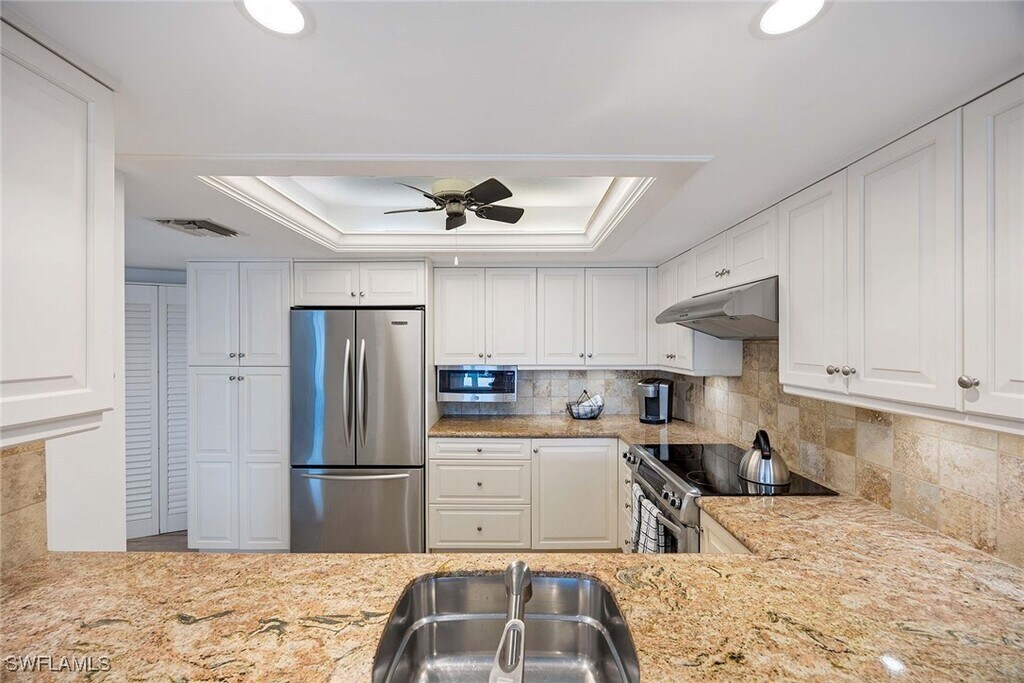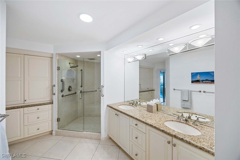 A place where picturesque sunsets,marine wildlife,and breathtaking views of the Gulf of Mexico are an everyday luxury. The gorgeous floor-to-ceiling windows provide you and your guests with unsurpassed,southern,western,and northern,panoramic views of the Gulf of Mexico and its’ white,sandy beach. Decorated with a crisp décor,this 2 bedroom,Den,3 bath,with travertine tile throughout,offers 2000’ of interior living space,2200’ total area,including the two screened lanais. Rarely does an “04” unit ( largest floorplan) come on to the market. As you enter this residence,you are surrounded by views of the gulf,and will appreciate the open floor-plan. The living room has a cream-upholstered L-shaped couch,side chair in a celery green upholstery,entertainment center with TV,accompany tables/lamps,lovely artwork,and touches of “Mackenzie Child’s” ceramics. The dining area has a rectangular table and seating for 6,offering views of the gulf. The well-inventoried kitchen offers all-white cabinetry,quartz counters and backsplash,butcher-block island,eat-in table,and looks out to the beach/gulf. The Primary suite offers a king-size bed,matching end tables/lamps,dresser,side chaise,TV,walk-in closet,private bath with a walk-in shower,dual vanities,and you will enjoy the stunning views,and direct access to the lanai. The first guest suite has a queen-size bed,with matching end tables,lamps,dresser,closet,views of the beach and gulf,and private bath with a shower. The Den is the 2nd guest area,offering a pull-out queen couch,desk area for 2,access to the lanai,and private bath with a shower. The lanai has a table and seating for 4 for dining; second lanai offers a conversation area,with 4 comfortable wicker chairs and table. The outdoor pool/spa and lanai area of the building has plenty of seating,umbrellas,gas grill area,and more. This condominium has everything you will need to enjoy your time in Naples. The Vistas offers wonderful amenities including 24-hour front desk attendant,guest suites to rent,fitness center,enclosed spa,saunas,steam room,social rooms,card room,extra storage,garage parking and renovated pool/spa deck with inspiring Gulf views. A short boardwalk will take you from the pool deck to the white sand beach. An easy walk to the Venetian Village shops and restaurants.