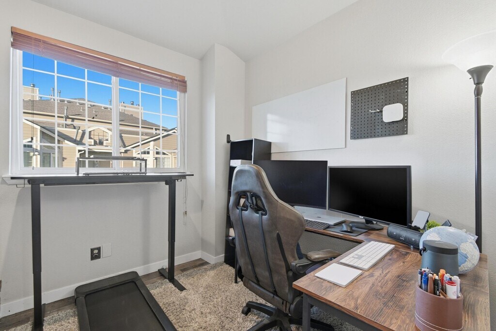 LIVE THE MOUNTAIN LIFESTYLE - In the city! Step into refined, modern living in this beautifully renovated luxury condo designed for both comfort and flexibility. The spacious one-bedroom layout includes a fully enclosed office that easily functions as a small second bedroom or private retreat. A striking double-sided fireplace creates warmth and ambiance, connecting the living area with the office for an open yet intentional feel. The chef-inspired kitchen features high-end appliances, including a double oven, making it ideal for both everyday living and entertaining. The spa-like bathroom elevates daily routines with a generous walk-in shower, rain-style showerhead, and built-in Bluetooth speakers. The oversized primary bedroom offers a massive walk-in closet and direct access to a private balcony—perfect for morning coffee or evening unwinding. Residents enjoy access to premium community amenities, including a pool, spa/hot tub, tennis courts, and a fully equipped exercise room. Additional highlights include abundant storage with an extra hallway closet and a secure, lockable storage area near the front entry, in-unit washer and dryer, and one assigned parking space. This thoughtfully updated condo blends luxury finishes with resort-style living. Visit the Mountain Haven website to fill out an application to set a showing.