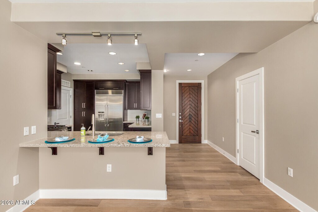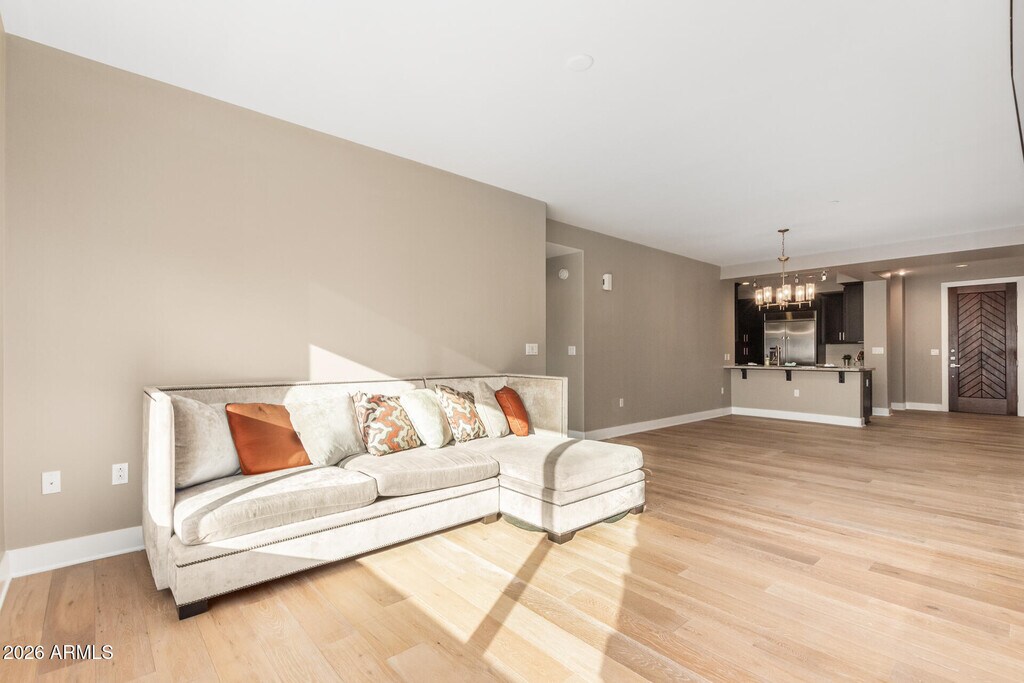 The Sage Condominiums in the heart of Downtown Scottsdale! This spacious 2-bedroom plus den residence combines elegant design with upscale comfort,perfect for seasonal or full-time living. Enjoy luxurious bathrooms with marble countertops,an open-concept kitchen with stainless steel appliances,light oak wood-style flooring,and a beautiful gas fireplace framed by floor-to-ceiling travertine tile. new carpet in the primary bedroom and new flooring in the living room,kitchen,and den. Enjoy resort-style amenities such as a sparkling heated pool,fitness center,clubhouse,wine storage room,and BBQ area; ideal for entertaining and relaxation.Located just steps from the Scottsdale Waterfront,Fashion Square Mall,and more MLS ID 6988846