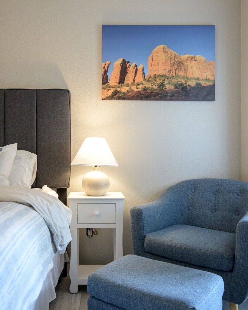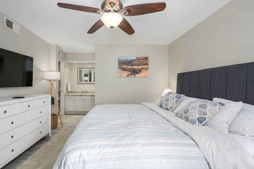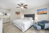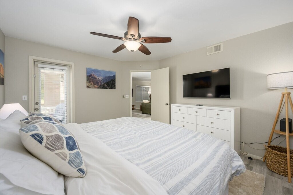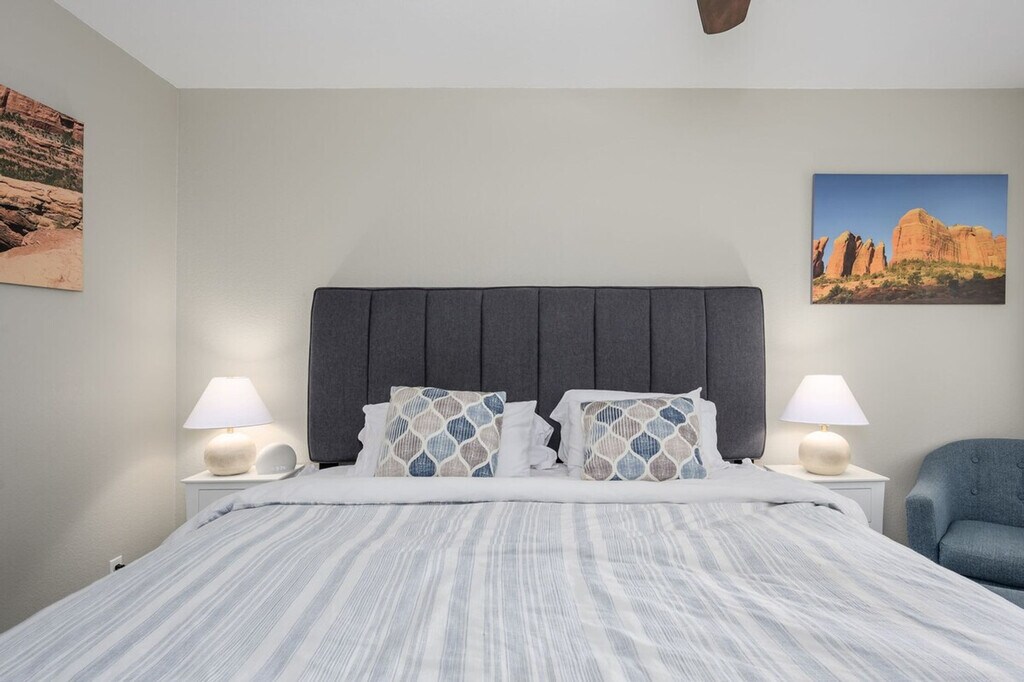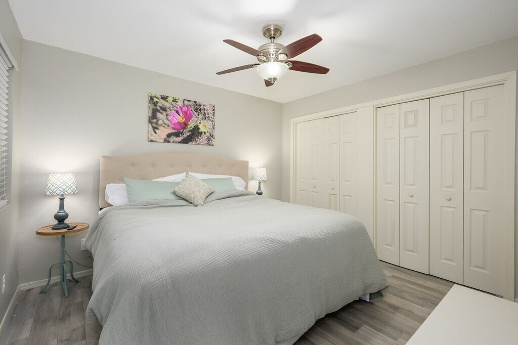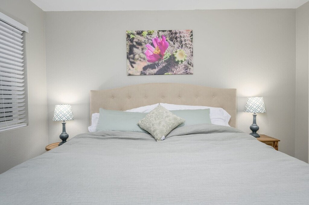 Feel at home in Villa Stone Creek, a thoughtfully decorated and remodeled 2-bedroom, 2-bathroom condo on the first floor with no stairs. As you enter the condo's great room, you'll find 2 comfortable couches facing a flat-screen TV, all open to the kitchen, breakfast bar, and dining area. You can also dine outside on the patio. The 2 bedrooms are on opposite sides of the condo and both provide a king-size bed, full bathroom, and televisions. All 3 TVs are smart TVs utilizing YouTubeTV for cable services, and you can also log in to any online service you have. All linens, bath, and pool towels are provided, and free Wi-Fi is available. The condo has an air mattress as well for an additional person to sleep, max 5. We can accept a pet for a $100 pet fee. You will have access to a covered reserved parking spot with additional uncovered guest parking spots. This quiet condo community offers a gym, heated pool, and hot tub just a 30-second walk from the front door. It is located in a prime location of Scottsdale, just steps to everything you would need. You can walk to restaurants, grocery stores, and nightlife. Hiking trails are just around the corner. The condo faces the golf course with a walking/running/biking path perfect for a workout or sunset stroll. All of this is located 15 minutes from PHX Sky Harbor Airport, 18 minutes to Old Town Scottsdale, and 13 minutes to Kierland. Mountain hiking trails are within 10 minutes. The public Stone Creek Golf Clubhouse is a 3-minute drive to tee off. Guests are liable for any damages caused to the property. [SI]
