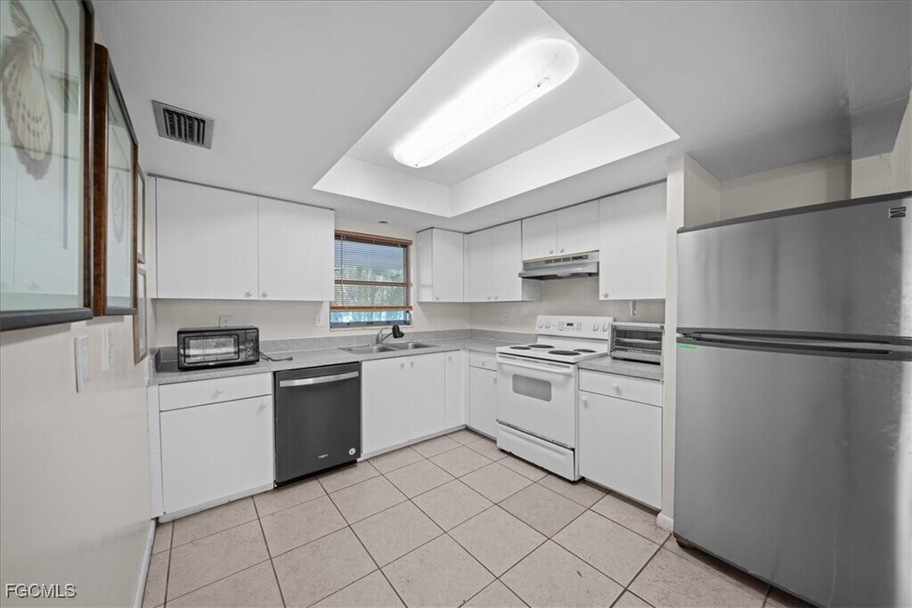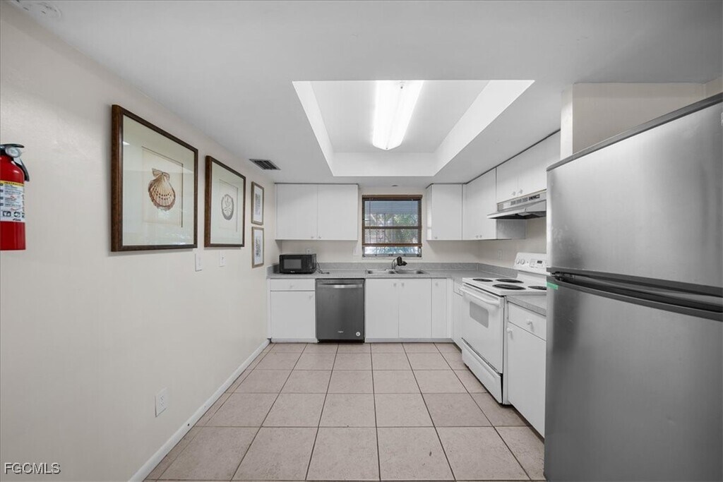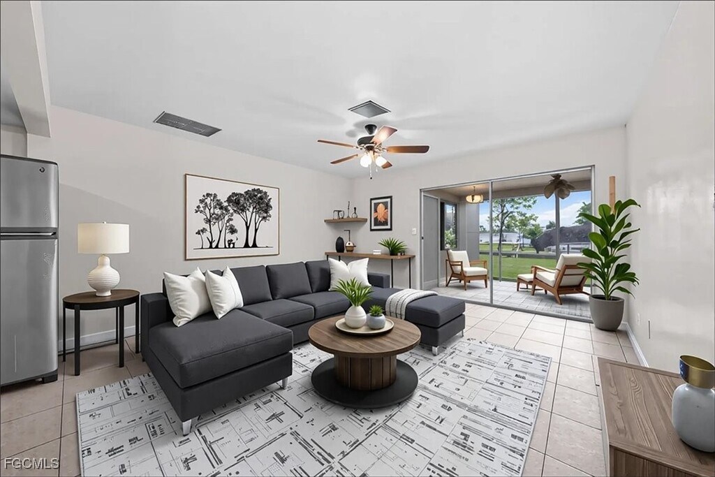 Discover the perfect blend of vintage charm and modern convenience in this beautifully maintained 2-bedroom, 1-bathroom apartment located in the vibrant heart of downtown Cape Coral. Designed with comfort and functionality in mind, this spacious unit offers the ideal setting for relaxing, entertaining, and everything in between. Step inside and enjoy the open and inviting atmosphere, with tile flooring throughout and large windows that flood the space with natural light. The generous living area seamlessly connects to the dining space-perfect for hosting family dinners or cozy evenings at home. The kitchen comes equipped with a refrigerator and stove, making meal prep a breeze.