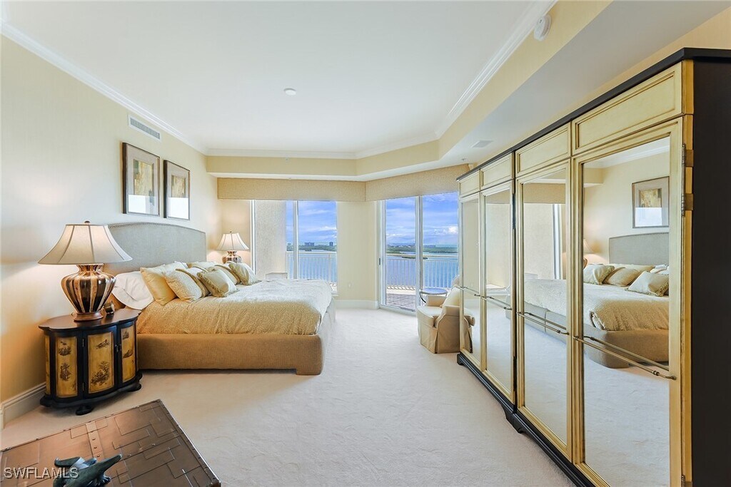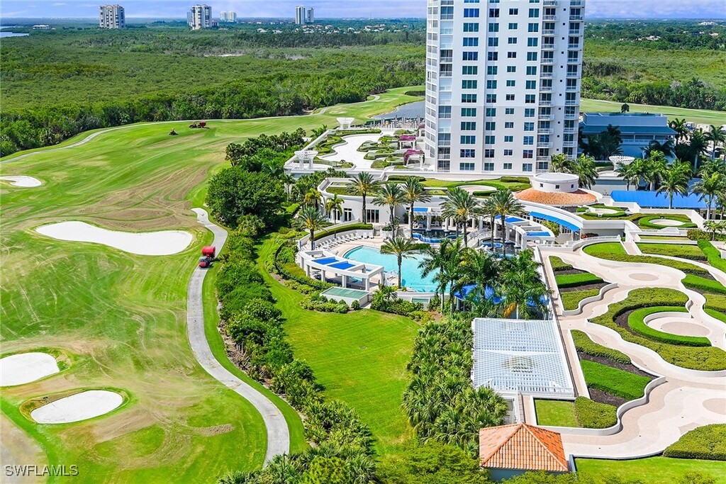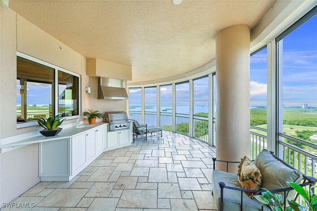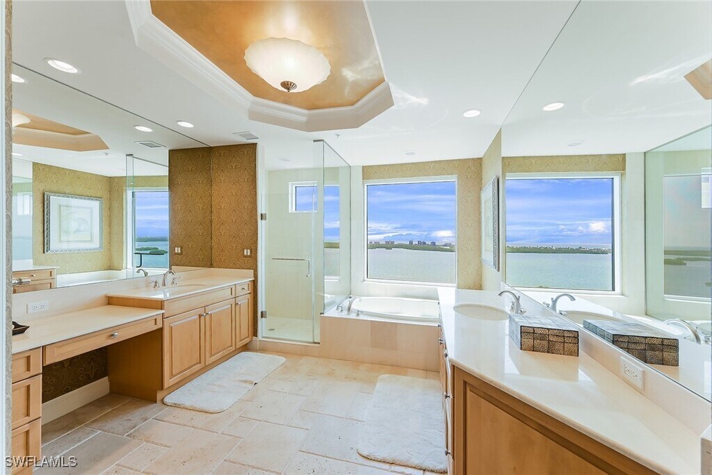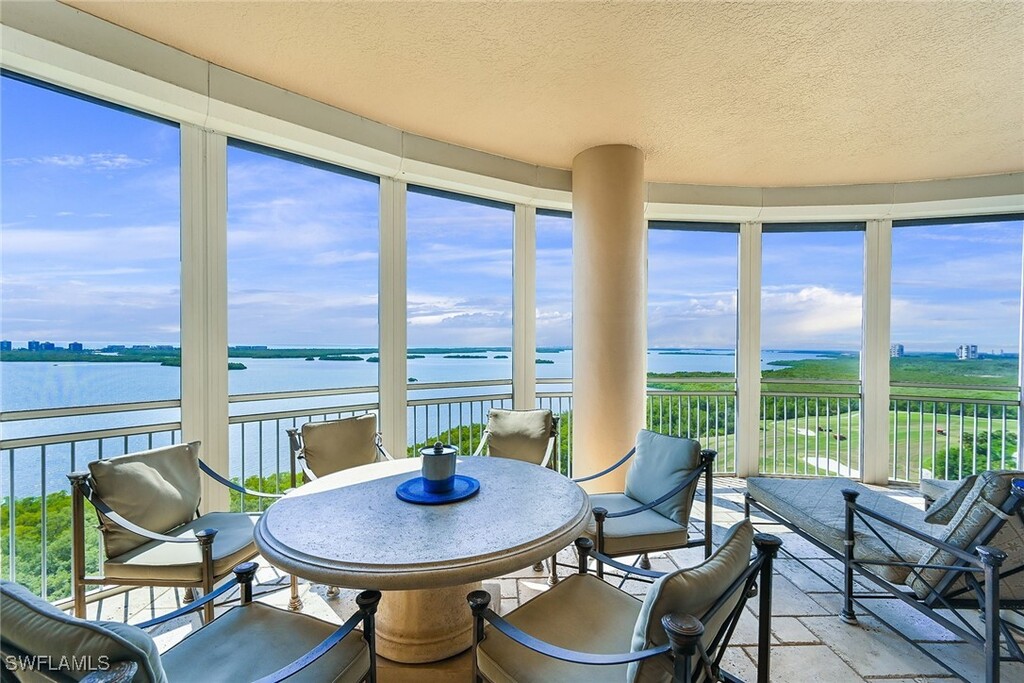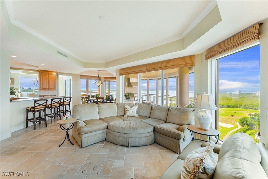 Imagine seeing the Gulf,bay,golf course and twinkling city lights all in one view! Three terraces and large sliding glass doors frame breathtaking views in all directions. This elegant yet comfortable 3,566 square foot condominium has travertine floors throughout the formal living area and dining room. The two carpeted primary Suites are both fitted with King size beds (one can be converted to two twin beds.) One primary bathroom has a water closet with a bidet,dual vanities and a soaking tub with a separate shower while the other ensuite bath offers a walk-in shower. A third guest room offers a queen bed and an adjoining bath,and there is also a sofa bed in the family room. Enjoy cooking in the gourmet kitchen offering plenty of cabinet and countertop space,a gas cooktop and a counter bar that opens to the eat-in area and family room OR cook on your own built in gas grill located on your screened lanai. Azure amenities include a resort style heated pool and spa,a screened Cabana Bar with a fireplace and TV,Theater Room,Fitness Center,Guest Suites,an On-Site Manager and more. Bonita Bay is an award-winning guard-gated golf course community with parks,preserves,and beautiful natural landscaping surrounding the 12 miles of walking/biking paths. There is also a marina with boat docks available to rent,waterfront dining,and three waterfront parks that feature canoe & kayak launches,picnic areas,fishing piers,boardwalks and playgrounds.