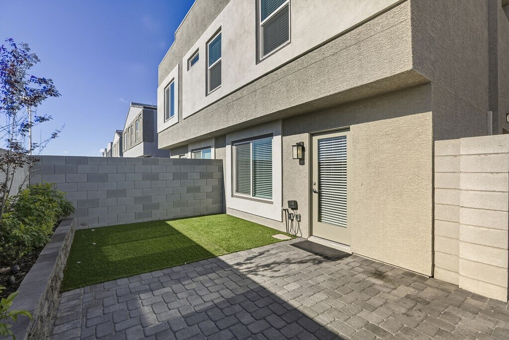 Welcome to this beautifully built 2025 townhome offering modern design, comfort, and convenience. This 2-bedroom, 2.5-bathroom residence features a smart layout with both bedrooms upstairs, each with its own private en-suite bathroom, and a convenient half bath downstairs for guests. The open-concept living area is ideal for relaxing or entertaining. The kitchen opens to the living space and features quartz countertops, custom cabinetry, stainless steel appliances, a large island, and a breakfast bar. All appliances are included. The home is located next to a grassy common area, providing an open feel, and includes a private backyard with low-maintenance artificial turf, perfect for outdoor enjoyment. Ideally situated just 5 minutes from Nellis Air Force Base and 20 minutes from the Las Vegas Strip, this townhome offers modern living with easy access to work, dining, and entertainment.